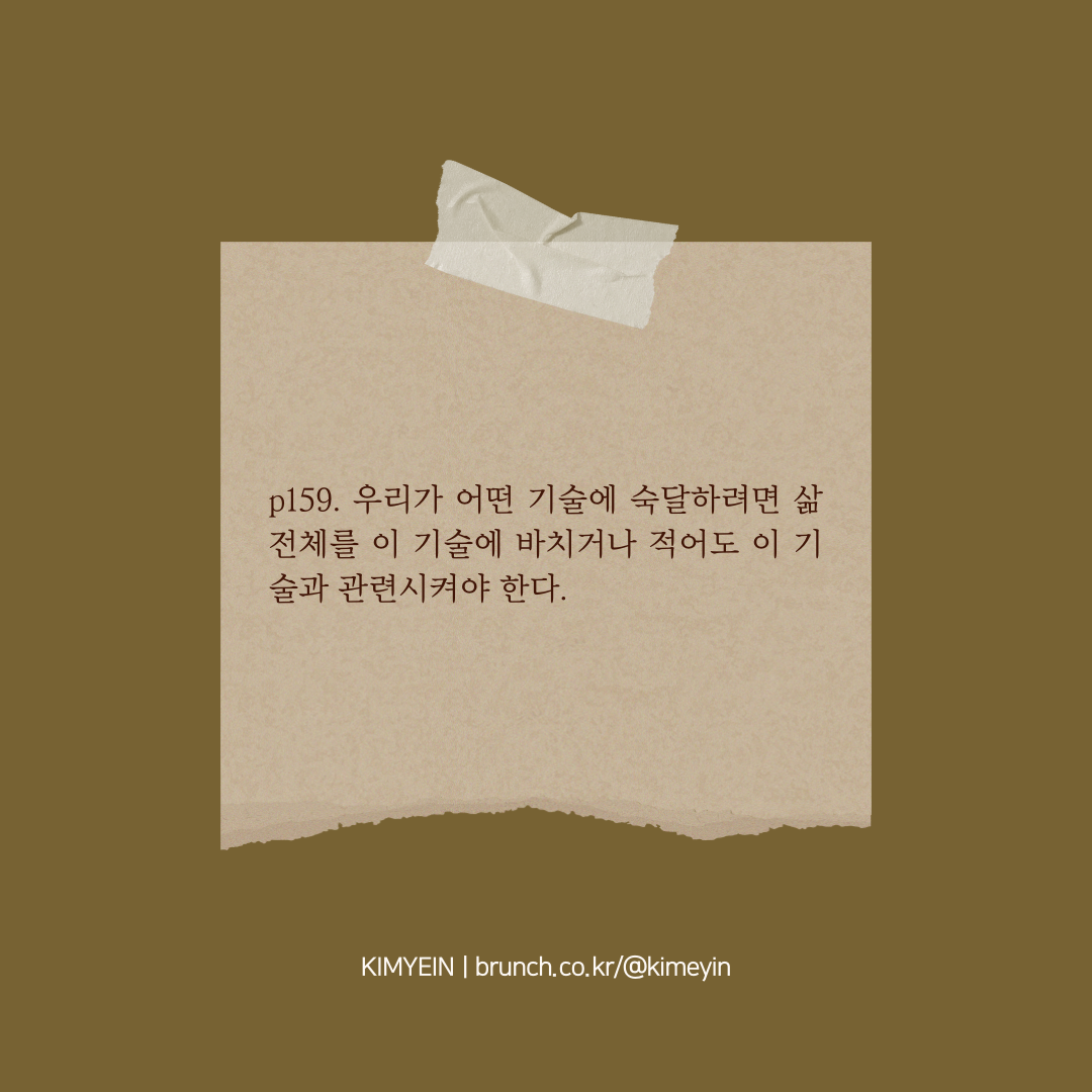 P159. 우리는 말하자면 기술을 직접적으로 배우기 시작하지 않고 간접적으로 배우기 시작한다. 우리는 그 기술을 배우기 시작하기 전에 다른 많은 일들 - 때로는 일견관계없는 듯한 일들 - 을 배워야 한다. 목공 기술을 배우는 자는 나무를 깎는 법부터 배워야 한다. 피아노 연주를 배우는 자는 음계 연습부터 시작해야 한다. - 우리가 어떤 기술에 숙달하려면 삶 전체를 이 기술에 바치거나 적어도 이 기술과 관련시켜야 한다. 자기 자신이 기술 훈련의 도구가 되어야 한다. 사랑의 기술에 대해서 이 말은, 이 기술 분야에서 명장이 되려는 야망을 가진 사람은 누구든지 삶의 모든 국면을 통해 훈련, 정신집중, 인내를 ‘실행’하는 것으로부터 시작해야 한다는 의미이다.