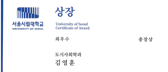 도시사회학 박사과정을 수료했다. 박사과정을 수료하면서 전 계열 대학원생 대상 최우수 연구자에 선정되어 서울시립대학교 총장상을 수상하기도 했다. 건축으로 시작해서 도시계획을 경유하고 (도시)사회학으로 이어지는 여정에 10년을 쏟았다. 게다가 박사학위 취득까지 시간이 얼마나 더 걸릴지 알 수 없다. 아직까지 박사학위 논문이라는 거대한 산이 남았지만, 몇 개의 봉우리를 가까스로 넘었다는 것에 자부심을 느낀다.