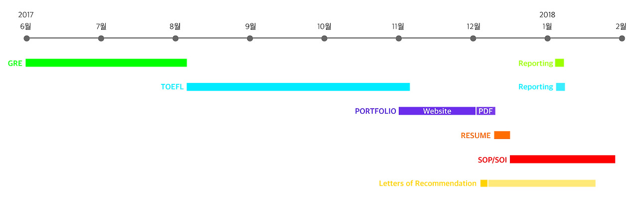 6월부터 제대로 시작했으니, 12월 말까지 7개월을 기준으로 계획을 세웠다. GRE 3달, TOEFL 2달, 포트폴리오 1달, 이력서는 하루 이틀이면 될 것 같고, 지원서 작성하는데만 1달을 꼬박 써야겠다고 다짐했다. 저대로만 갔어도 최강 한파에도 행복하게 바깥 외출을 했을지도 모른다.