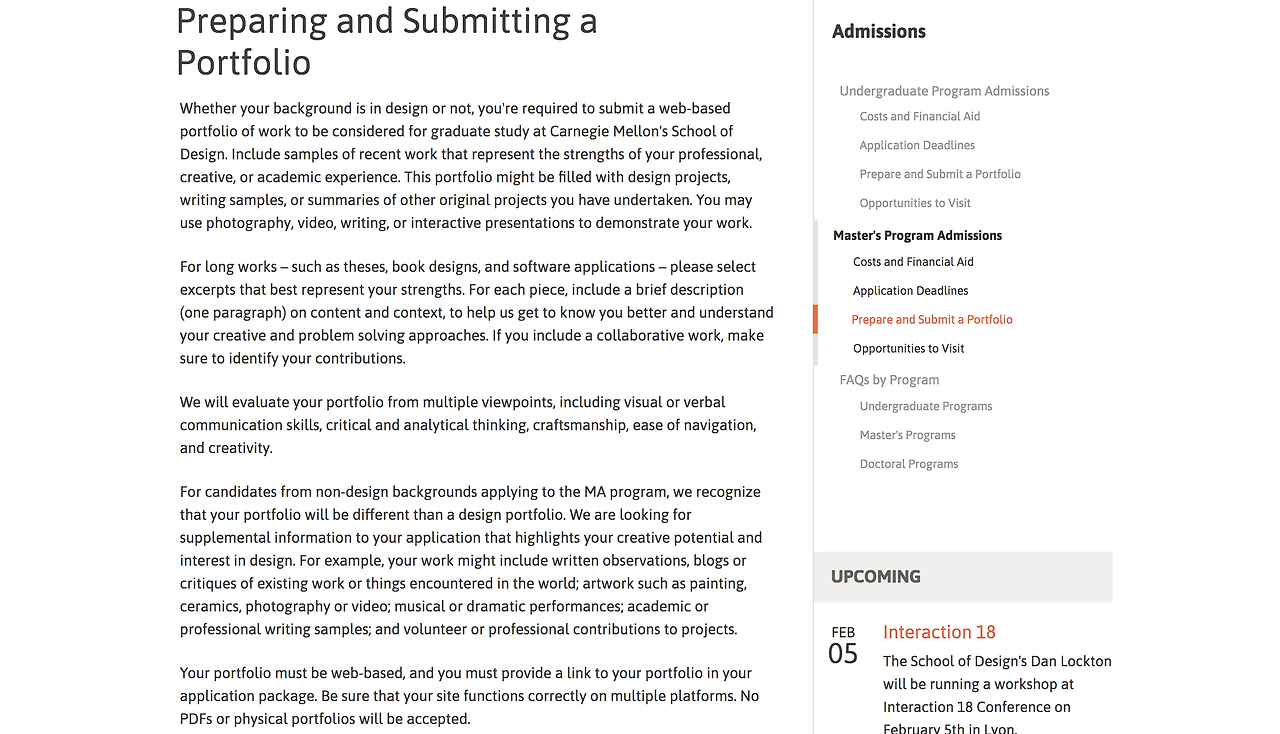 종합대학이든 Art School이든, 학교마다 요구하는 포트폴리오 양식이 다르다. 그래서 무작정 웹사이트를 만들거나, InDesign으로 시작하기 전에, 각 학교 사이트의 Admission Requirements에서 정확하게 그들이 원하는 게 무엇인지 조사할 필요가 있다.
