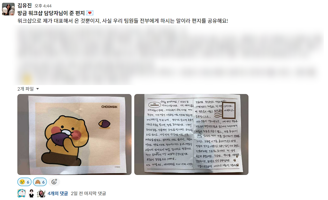 마음이 보람과 감사로 서서히 번져갔다. 나는 걸음을 재촉해 카페로 달려가 팀 메신저로 팀원들에게 편지를 공유했다. 나에게 전한 편지지만 사실 마음여행키트를 함께 만든 우리 팀원들에게 쓴 편지이니, 내가 느낀 감동을, 우리가 하고 있는 일의 의미를 빠르게 공유하고 싶었다.