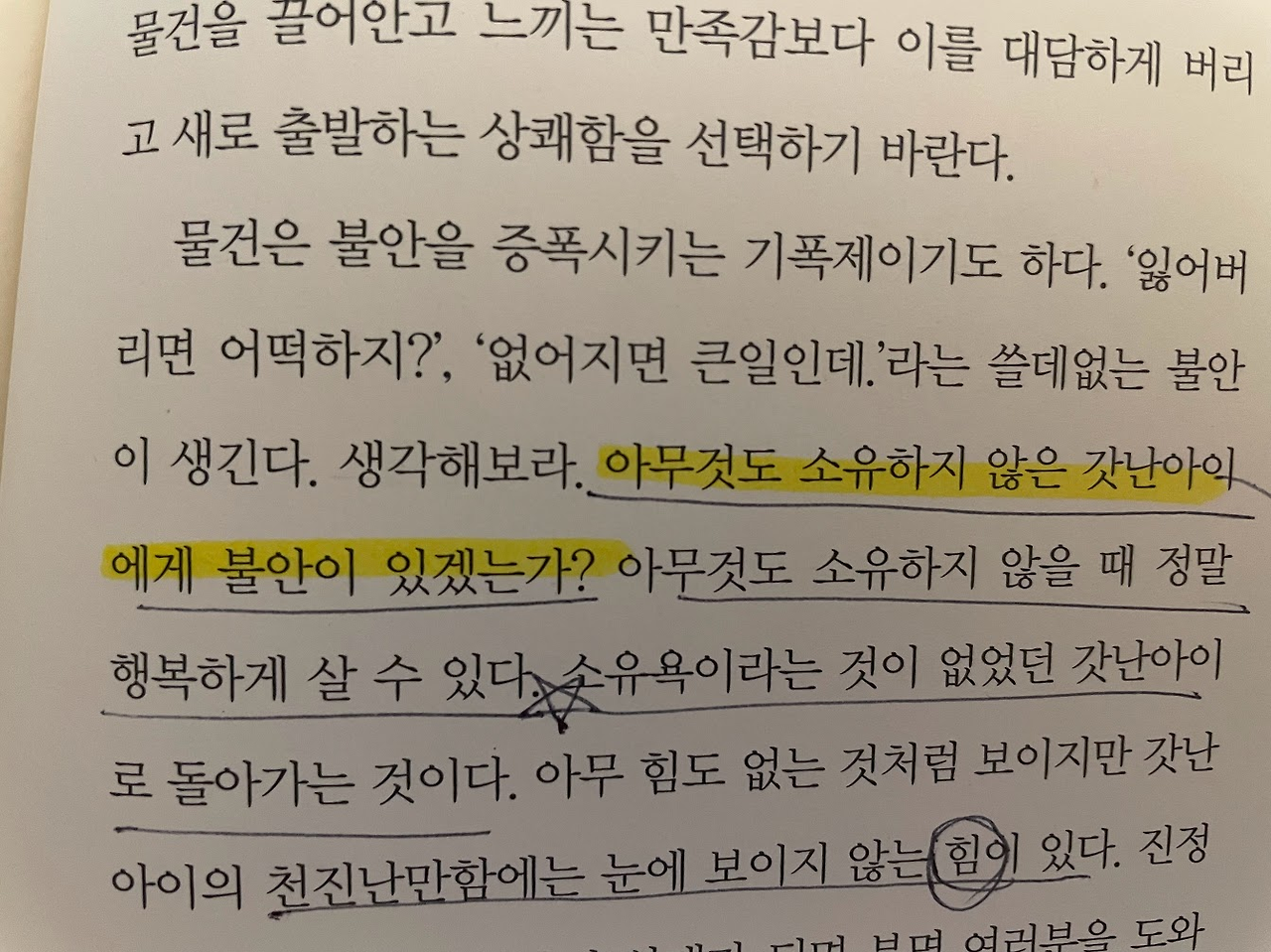 이 책의 어떤 부분은 마냥 이상적인 소리처럼 들리기도 했지만, 나 또한 이상을 꿈꾸는 사람이기 때문에(?) 그 부분조차 마음에 들었다. 책의 대부분이 밑줄표시와 형광펜 표시로 가득했다.