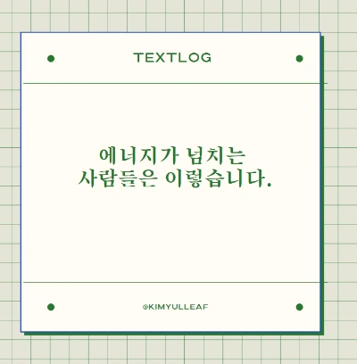 사람마다 에너지의 높고 낮음이 있다는 생각을 합니다. 에너지는 눈에 보이지 않지만, 표정, 목소리 톤, 말의 빠르기, 걸음걸이, 말의 어투, 눈빛에서 느낄 수 있죠. 한 사람도 때로는 활기찰 때가 있고, 일이나 감정적으로 힘들 때는 지쳐 에너지가 바닥이 되기도 합니다. 그런데도 평균적으로 에너지가 높은 사람들이 있지요.