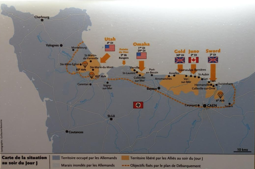 다음날 오후에는 1944년의 노르망디 상륙작전을 기억하는 해안을 찾았다. 넓은 노르망디 해안 여러 곳에서 진행된 상륙작전이었기에 기념관이나 기념비도 한두 곳이 아니다. 선택을 해야 했다. 해안에서 조금 떨어진 거점 도시 캉(Caen)에는 전쟁기념관 겸 박물관(The Memorial de Caen)이 있다. 인구 10만 명 정도의 이 도시는 노르망디에서 루앙과 르아브르 다음으로 큰 도시다. 2차 대전 당시에도 주요 거점이었고 내내 전쟁터였다. 캉 전쟁기념관은 규모가 대단히 컸다. 노르망디 상륙작전 전후 상황을 자세하게 전시하고 있고 영상관도 있다. 그러나 기념관 전체에서 노르망디 상륙작전의 비중은 3분의 1 정도다. 3분의 1은 2차 대전 전체를, 나머지 3분의 1은 냉전 시기를 전부 커버하고 있다. 2차 대전 전체와 냉전 전시도 잘 되어 있었지만, 아무래도 유심히 보게 되는 곳은 상륙작전 관련 부분이다.