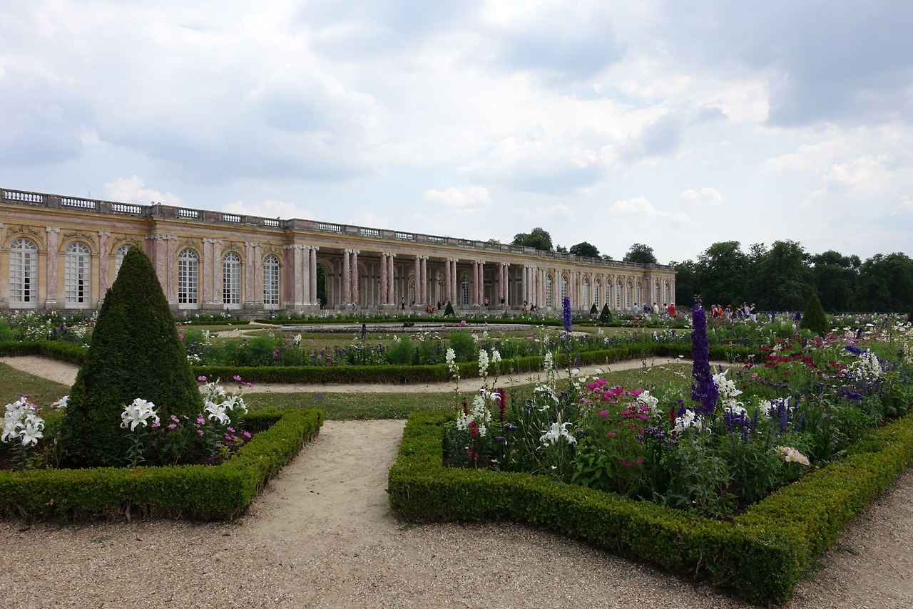 본궁 관람을 마치고 기특한 한국어 오디오 가이드를 반납하고 나오니 오후 세 시의 햇볕이 따가웠다. 도저히 정원을 걸어 다닐 수는 없고, 전동 카트는 대기가 많아서 꼬마기차를 선택했다. 그것도 줄이 꽤 길어서 땡볕에 이십여 분 서서 기다리는 게 꽤 고역이었다. 기차는 정원 내를 달리는 게 아니고 바깥으로 가기 때문에 정원 경치를 즐기는 의미는 없었다. 그래도 덕분에 트리아농 구역에 발을 들여놓을 수 있었다. 그렇게 큰 본궁이 있는데도 이렇게 멀리 별궁을 또 지은 이유는 프라이버시 때문이었다고 설명을 한다. 즉 본궁은 아무리 골방을 만들어도 사람들이 많이 드나드는 곳이라 왕이 애첩이었던 부인들과 사생활을 즐길 수 없었다는 거다. 유명한 퐁파두르, 뒤바리 같은 부인들에게 '선물'하고 기거했다고 한다. 물론 멀어 봤자 정원 건너편이지만 그 정원이 너무 커서 마차로 와야 하는 격리된 구역이다. 따로 구획된 정원을 갖춘 그랑 트리아농은 그런 의미에서 작은 궁전에 가깝다. 긴 건물을 따라 색다르게 꾸민 방들이 이어져 있고 창문도 커서 채광이 좋다. 궁전 안에 갇혀있던 공주들 방보다 훨씬 천정도 높고, 개방적인 구조로 파티하기 좋은 곳이었다.