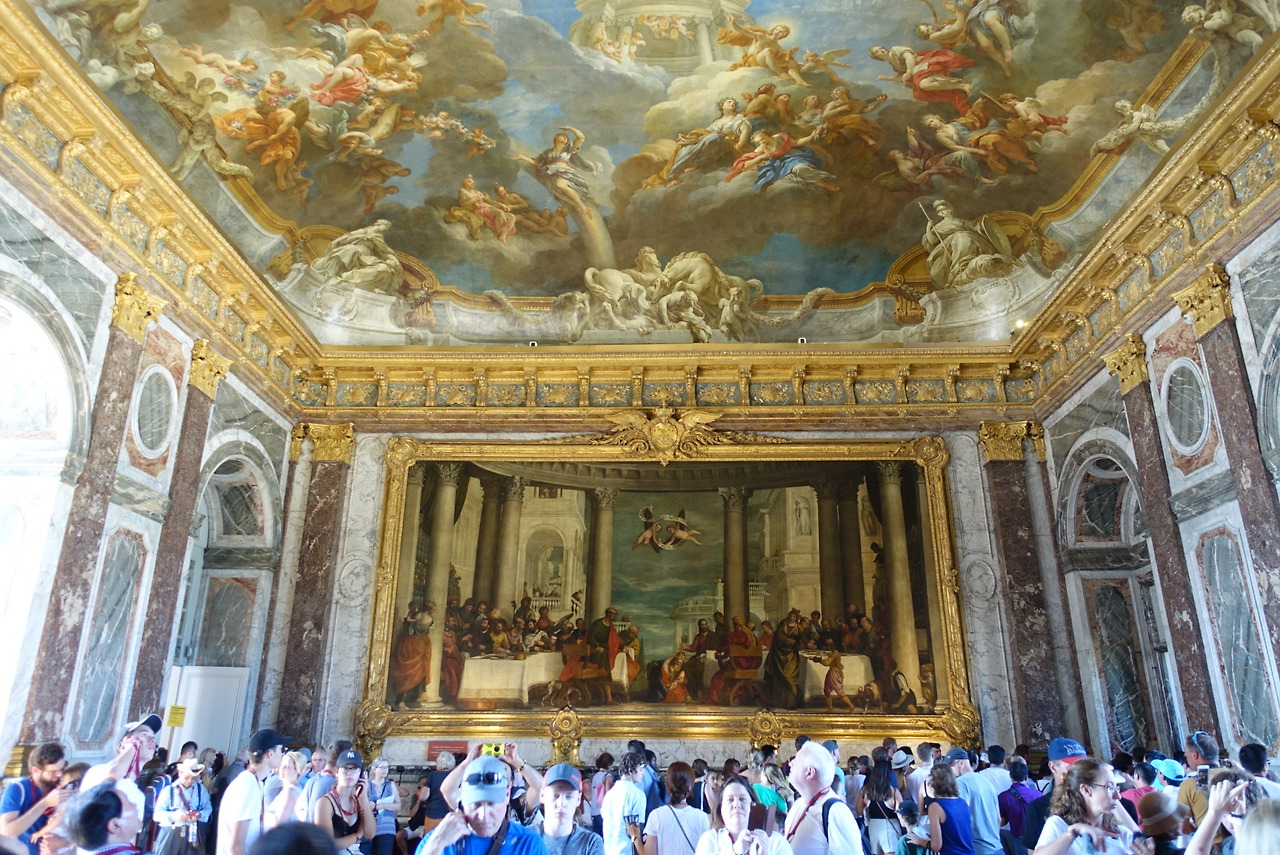 베르사유 궁전은 나와 아빠는 두 번째였다. 나는 17년 전 대학생 배낭여행 때, 아빠는 더 오래전 어떤 출장길에 들르셨다고 한다. 사실 궁전 내부는 별로 새로울 것 없을 거라 생각했었다. 너무 크고 무조건 화려하기만 하다는 기억이 남아있어서 큰 기대도 안 했다. 그런데 한국어 오디오 가이드를 받아서 이어지는 방들마다 설명을 들으며 다니다 보니 새삼스레 흥미진진하고 다채롭게 보였다. 궁전이 새삼 바뀌었을 리는 없다. 오래되어 잊었던 것일 수도, 나이 들어서 시각이 바뀐 것일 수도 있다. 한국어로 되어 있어서 편하게 들린 오디오 가이드 덕분이기도 했다. 날씨가 너무 좋아서 내부도 밝게 빛났고 황금이 아닌 부분들도 색깔이 살아났다. 관람 초반부 접견실이나 연회장 구역에 규모가 크고 화려한 방들이 몰려 있다. 새빨간 천으로 강한 인상을 주는 루이 14세의 침실도 나오고, 한 시간쯤 구경하다 보면 그 유명한 거울의 방 연회장이 등장한다. 규모와 화려함도 대단하지만, 이 구역은 관람객 인구밀도도 정말 대단하다. 베르사유를 짧게 보고 떠나는 사람들이나 단체 관광팀도 이 화려한 방들은 꼭 보고 가기 때문이다. 아빠가 처음 오셨던 옛날에는 개방된 구역이 이 정도였다고 한다. 지금은 훨씬 많은 방과 전시실이 관람 동선에 이어져 있다.