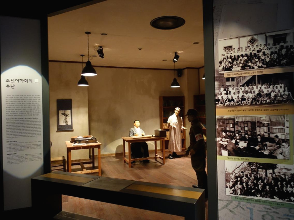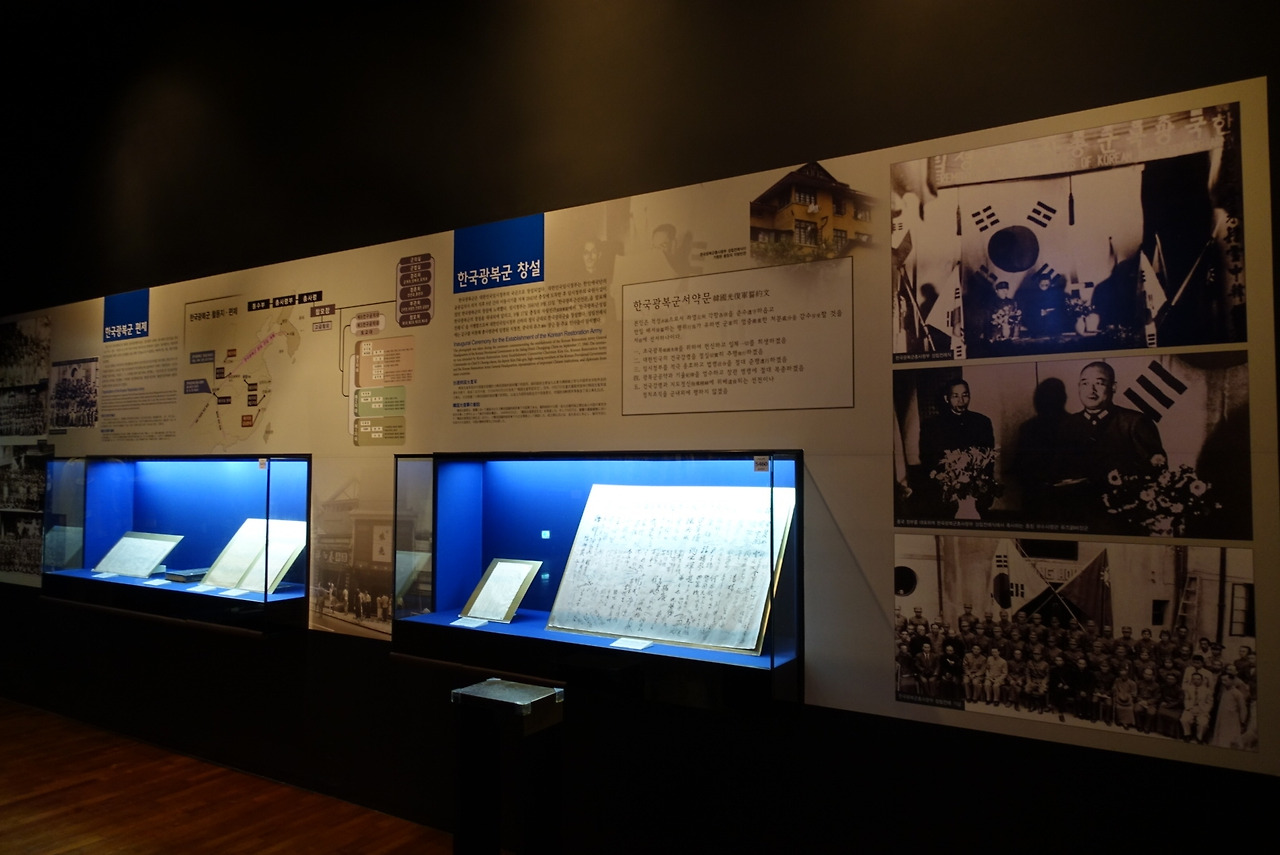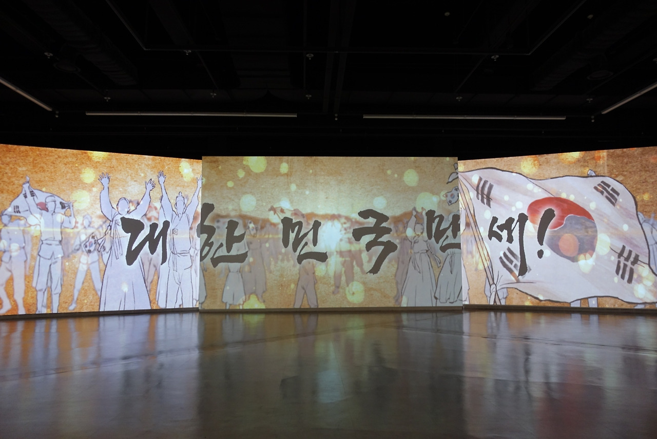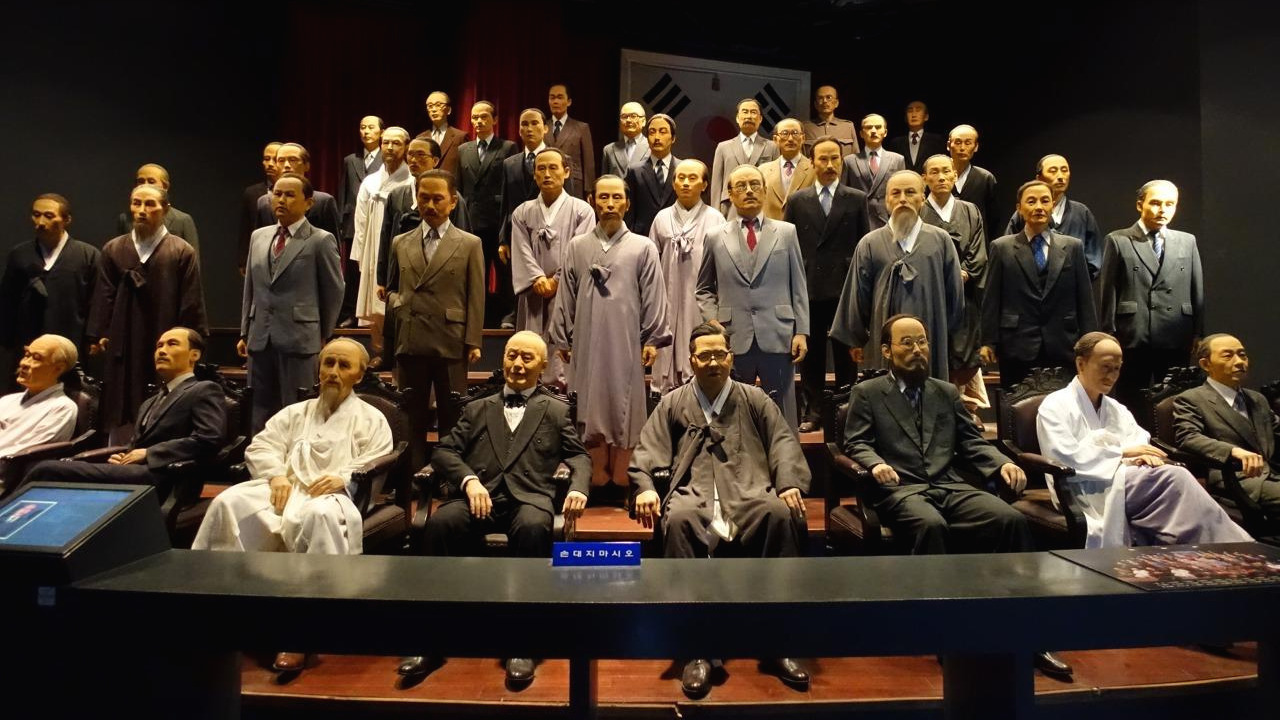 3.1 운동을 다룬 3관의 굳게 닫힌 문을 아쉬워하며 건너 들어간 4관은 가장 현대적인 전시관이었다. 유물이나 설명이 아니라 이미지와 영상만 감상하는 '감성관'이라고 되어 있다. 큼직하게 구획을 잡아 글귀나 영상을 비추고 소리와 색깔을 이용한다. 물론 등장하는 글귀나 영상은 모두 투지와 결기가 가득한 내용이다. 그래도 험악한 이야기가 계속 나오는 전시를 계속 보는 중간에 쉬어 가는 페이지가 되었다. 5관은 주로 만주 등 해외의 대일 군사 항쟁, 폭탄 투척 등 의거, 탄압받은 사건들을 다루고, 6관은 독립운동의 중심이 되었던 모임과 단체를 설명한다. 한글 보존을 위한 조선어학회나 교육 운동, 스포츠, 예술 쪽의 활동은 전부 6관이다. 김구 선생과 임정의 활동이 비주얼의 대부분을 차지하고, 무서웠던 임정 요인들의 밀랍인형 군상은 조명과 컬러가 더 선명해졌다. 일일이 읽지는 않고 어떤 내용을 어떻게 다루는지 보면서 지나다 보니 다섯 개 관에 두 시간 정도 걸렸다. 6관 마지막은 순식간에 광복과 대한민국의 발전으로 마무리하는데 출구 부분은 하필 G20 정상회의(2010년)로 끝난다. 옛날에는 88 서울 올림픽으로 끝났을 텐데, 마지막 리모델링이 이명박 정부 때였던 모양이다.
