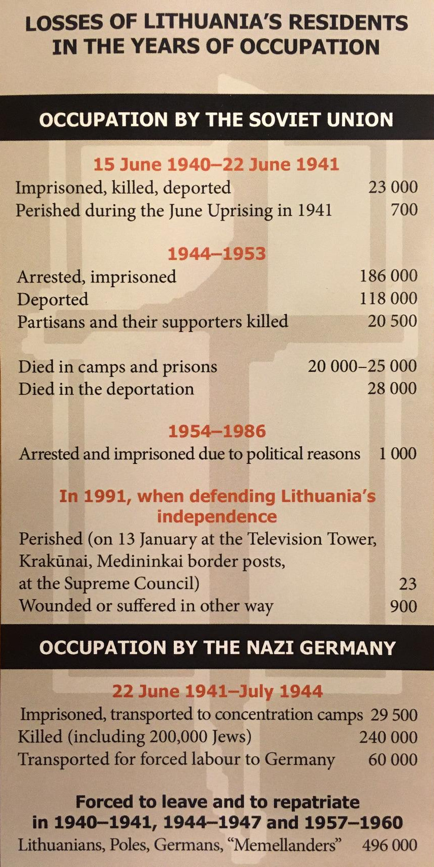 소련 지배 시기에 대한 리투아니아 사람들의 기억은 끔찍함 그 자체이다. 간혹 한국에서 구소련 체제전환국들의 오늘을 평가하면서 소련 시절에 대한 향수를 이야기하는 경우가 있다. 마치 부작용 많은 자본주의보다 차라리 공산주의 치하가 좋았을지 모른다는 식으로 쉽게 말할 때가 있다. 경험해보지 않은 입장에서 그렇다 아니다 할 수는 없지만, 적어도 리투아니아에서는 그 누구도 그 끔찍한 시기에 대한 향수 같은 건 내비치지 않는다. 그런 면에서 정말 반공정신이 투철한 나라이다. 발트 국가들은 체제 전환 후의 상황이 안정적이고 유럽연합에도 가입하며 성공적인 발전을 하고 있어서 그럴지도 모른다. 지금도 러시아의 안보위협이 있기 때문에 그럴 수도 있다. 하지만 체제 전환이 성공적이지 않고 러시아의 위협이 없었더라도, 리투아니아 사람들에게 소련 시절은 예외 없이 압제와 수탈로 기억될 뿐이다. 아무리 빈부격차나 불평등 문제가 심각해도 그 시절로의 회귀는 결코 있어서는 안 되는 일이다.