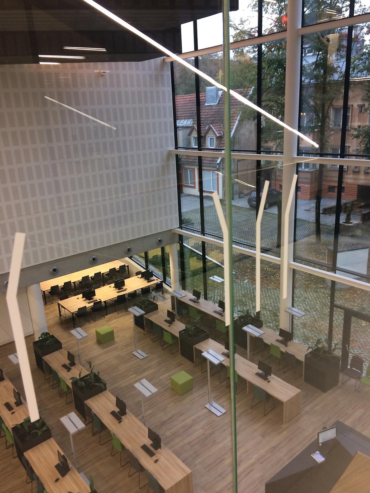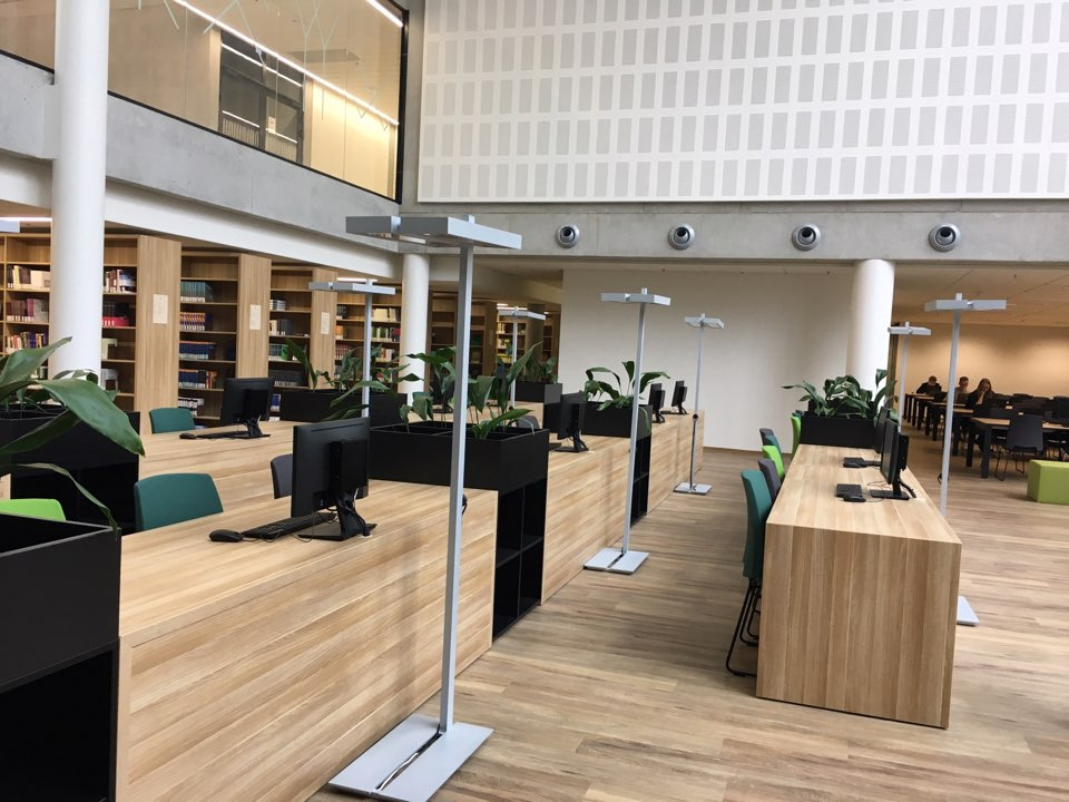 새로 짓는 건물들은 최대한 아래위로 넓게 트이고, 채광이 잘 되도록 개방된 공간으로 만든다. 학교 건물도 예외가 아니었다. 강의실 문이나 벽이 유리로 되어 있어서 밖에서 지나다니는 사람들이 훤히 보이는 경우도 많다. 중앙이 통으로 뚫린 아래층에 도서관이 있어서 책이며 열람실이 몽땅 드러난 구조는 좀 황당했다. 이곳 도서관은 결코 조용한 공간이 아니다. 소리가 더 잘 울리게끔 듯 뻥 뚫린 구조 아래 학생들의 모임이나 토론이 꽤 자유롭다. 식당은커녕 매점은 없고 자판기뿐이라는 점은 당황스러우면서 아쉬운 특징이다.
