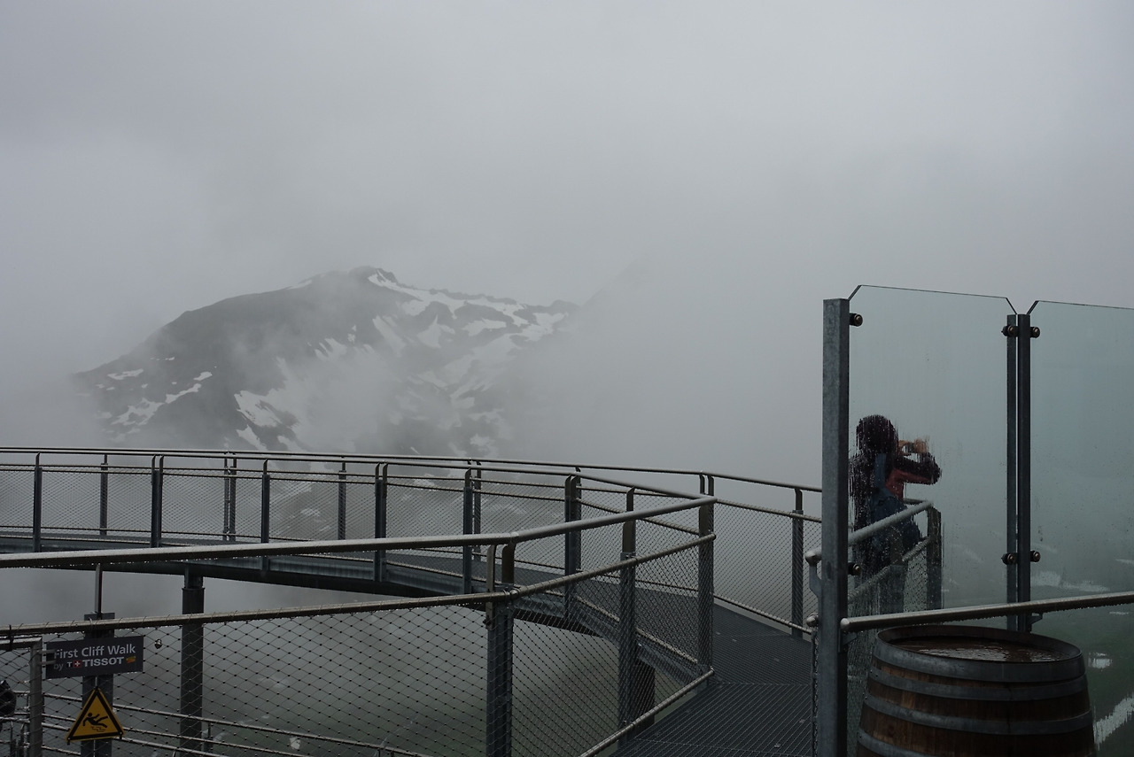점심 즈음해서 관광객이 늘어나는 융프라우 전망대를 빠져나왔다. 내려오는 길은 다른 방면 산자락의 그린델발트 마을에서 갈아타는 코스를 잡았다. 라우터브루넨에서 뮈렌 마을로 가는 케이블카가 있던 것처럼, 그린델발트에서는 휘르스트라는 다른 산을 오르는 곤돌라가 있다. 혹시나 그쪽 산은 날씨가 괜찮지 않을까 싶어 곤돌라를 타보기로 했다. 2일간의 자유이용권을 톡톡히 활용하겠다는 욕심도 있었다. 하지만 기대와 달리 곤돌라를 탈 때부터 비가 내렸다. 곤돌라만 30분 가까이 타는 내내 바람도 꽤 있었다. 결국 엄마는 멀미 증세를 보이셨다. 고생스럽게 도착한 휘르스트의 산장 주변에는 절벽을 따라 야심 차게 만든 스카이워크가 설치되어 있다. 변화무쌍하게 움직이는 구름 사이로 언뜻언뜻 절벽 풍경이 보였지만, 얼음 같은 비가 계속 내려서 감상을 하기에는 무리였다. 따뜻한 차를 마시며 산장에서 몸을 녹이는 것으로 6월의 인터라켄 산 구경을 마무리했다.