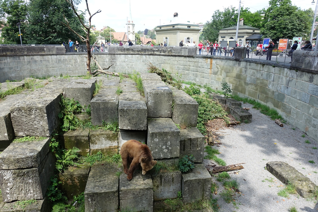 도시 풍경이 좋아서 시들어가는 장미마저 예뻐 보인 장미정원 출구에서는 베른에서 오랜 시간을 보냈다는 알버트 아인슈타인 동상을 만나기도 했다. 언덕을 내려와 구시가로 진입하는 다리를 건너는 지점에서 곰을 만났다. 사람들이 모여있기에 무슨 구경거리인가 했는데, 움푹 파인 우리에 진짜 갈색곰이 살고 있었다. 곰이 상징이라는 것은 알고 있었지만, 구시가 진입로 앞에 곰을 기르고 있을 줄은 몰랐다. 알고 보니 곰 우리 연결통로가 강 쪽으로 나있었다. 다리 아래로 강 한쪽 비탈 거의 전부가 곰들의 운동장이었다. 좁은 공간에 가둬두고 눈요기로 삼는다기보다는 넓은 곰의 영역 중 한 곳을 사람들이 보기 편한 모양으로 만들어놓은 거였다. 마침 고맙게도 그 공간에서 놀아준 곰이 있어서 알아봤지, 다른 구역에서만 놀고 있었다면 곰이 있는 줄도 몰랐을 터다.