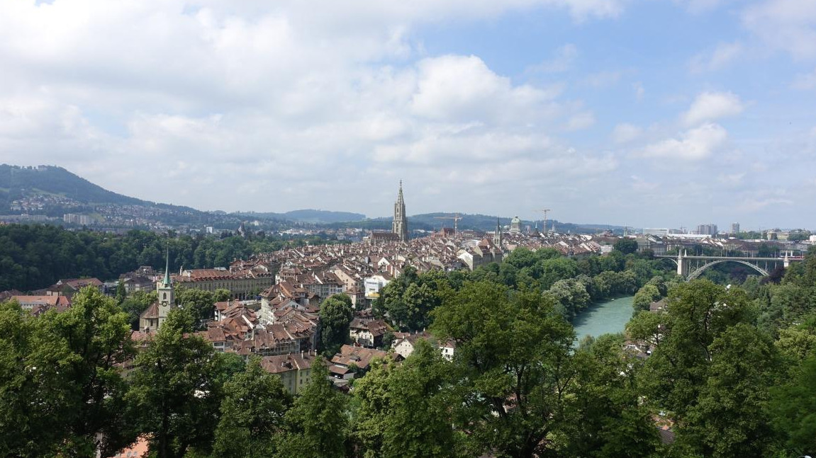 흰 구름이 드문드문하지만 화창해져서 밝은 햇살이 비치는 날이었다. 몽트뢰의 레만 호수 주변을 떠나 한 시간 반 정도 달려 베른 구시가에 도착했다. 검색에 나온 장소 중 전망이 보인다는 장미정원에 올라설 때만 해도 별 기대가 없었다. 비탈길을 꽤 올라가서 만난 장미정원은 계절이 잘 맞지 않았는지 큰 감흥이 없었다. 노래 가사에 나오는 '아름다운 베르네 산골'의 '알핀 로제스'를 기대했으나, 장미보다는 시민들의 휴식처라 할 만한 공원이었다. 장미는 별로였지만 반전은 있었다. 정원 테라스에서 한눈에 내려다보이는 베른 구시가를 본 순간 여기가 필수 코스임을 인정하지 않을 수 없었다. 강이 말발굽 모양으로 끼고도는 가운데에 언덕으로 올라앉은 베른 구시가지는 잘 가꾼 중세풍 도시의 아름다움을 과시하고 있었다. 우뚝 솟아오른 뮌스터(교회당) 첨탑 아래로 고르게 자리 잡은 벽돌색 삼각 지붕들과 굴뚝이 조화를 이루고 있다. 몇몇 건물들의 좀 작은 첨탑이나 종탑, 강에 놓인 다리까지 강과 주변의 푸른 산 색깔과 어울려서 "이게 바로 스위스 도시"라고 뽐내는 것 같았다.