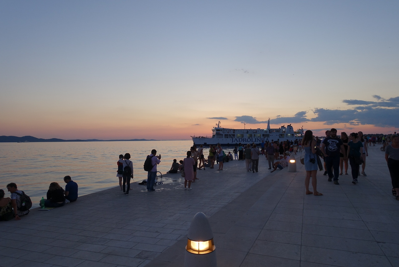 모두가 인정하는 자다르 석양 포인트는 바다 오르간이 있는 요새 밖 해변 공원이다. 이미 수많은 사람들이 끄트머리에 자리를 잡고 있었고 하나 있는 카페는 만석이어서 엄두를 낼 수 없었다. 식사는 석양 이후로 미루고 우리 가족도 끄트머리에 자리를 잡았다. 바다 오르간은 불과 몇 년 전에 설치한 작품인데 석양을 기다리는 사람들에게 신기한 소리로 흥미를 더해준다. 파도에 따라 울려오는 소리를 들으면서 수평선까지 천천히 떨어지는 일몰을 구경했다. 구름이 많지 않아서 색깔이 별로일 거라 생각했는데, 명성이 헛것은 아니어서 시시각각 변하는 색깔로 지루할 틈이 없었다. 이 해변 공원은 요새 안쪽의 구시가와 딴판으로 현대적이어서 바다 오르간도 있고, 투명하게 판을 깔아 설치한 바닥분수도 있다. 그 공간들마다 사람들이 나름대로 추억을 만들면서 연신 사진을 찍는다. 우리 가족도 일몰을 배경으로 수없이 사진을 찍고 해가 완전히 넘어간 후에야 자리를 떴다. 어두워지면서 불을 밝힌 구시가 분위기는 또 색달랐고 아직 거리는 떠들썩했다. 길거리 피자로 저녁을 때우며 구시가를 구경하고 다녔다. 총 운전 시간이 6시간이 넘은 하루였지만, 멋진 석양과 야경으로 피로마저 잊어버린 크로아티아 여행의 첫날이었다.