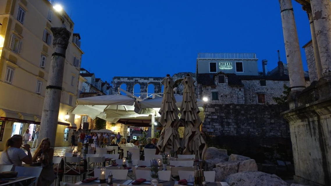 낮에 햇빛을 받아 하얗게 빛나는 고대의 석조 유적은 밤에는 또 다른 분위기가 난다. 스플리트도 야간 조명을 잘 설치해서 고대나 중세 유적이 밤에도 빛을 발한다. 체계적인 스포트라이트도 멋진 효과가 나지만, 스플리트의 강점은 그 유적 위에서 호텔이나 레스토랑, 카페들이 늦게까지 운영한다는 거였다. 영업용, 생활용 소소한 불빛들이 야경을 훨씬 다양하게 만든다. 식당이나 바 종류에 따라 들리는 소리나 냄새도 다 달라서 유적이 죽어 보이지 않고 같이 살아가는 느낌이다. 물론 유적을 잘 보존하고 보호하는 것도 중요하다. 계속 밟고 만지고 테이블과 의자를 깔면 그게 소홀할 수 있다. 그래도 이렇게 살아있는 공간으로 활용하는 것 역시 보존의 한 방법이다. 좀 더 닳는다 해도, 사람이 남긴 장소는 계속 사람이 써야 생명력이 이어지는 게 아닐까? 고대 황제의 무솔레움 옆에 접이식 테이블을 깐 레스토랑 야외석에서 피자를 시켜놓고, 무너진 회랑 기둥을 팔걸이 삼아 만지작거리면서 든 생각이다.