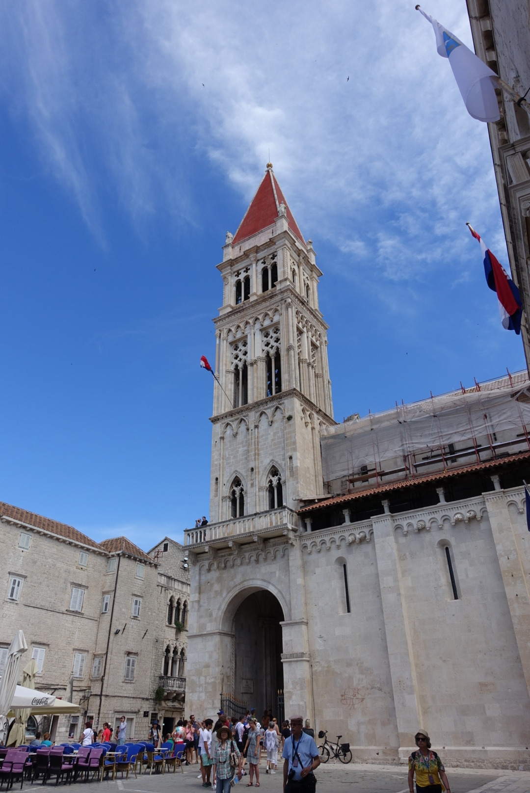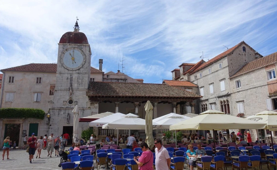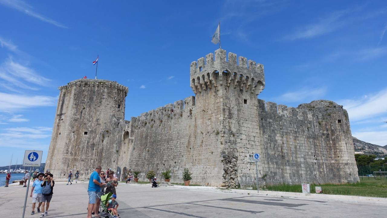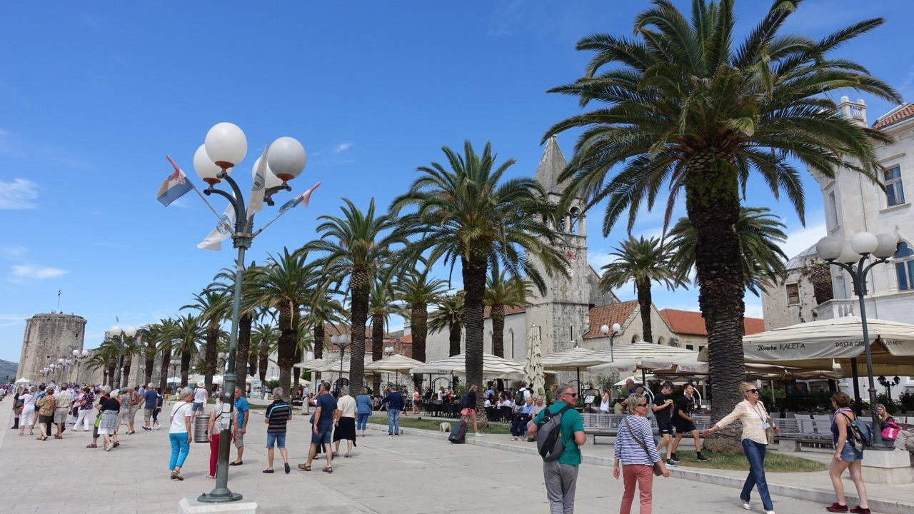 트로기르에도 항구는 고대부터 존재했다고 한다. 지금 남은 구시가 유적은 주로 중세 베네치아 지배 시기를 재현하고 있다. 스플리트와 가까우니 당연히 로마 시절부터 쓰임새가 많았을 것이다. 본격적인 개발은 11세기경부터 베네치아의 영향을 받으면서 시작되었다. 14세기부터는 아예 4백 년간 베네치아의 직접 지배를 받았다고 하니, 거의 8백 년을 베네치아의 영향 아래 있었다. 구시가를 둘러싼 성채도 십자군 성채처럼 생겼고 성당이나 공공건물도 중세 고딕, 르네상스 이탈리아 느낌이 많이 났다. 지금은 화창한 날씨와 어울려 반짝이는 작은 휴양도시다. 특히 남쪽에 일직선으로 뻗은 널찍한 해안 부두가 일품이다. 두꺼운 성벽은 일부만 남았고 중세풍 건물들이 노출된 해변 광장이 되었다. 200미터 넘는 긴 콘크리트 해변 광장에 일렬로 야자수를 심었다. 트로기르 홍보 사진마다 나오는 광경인데, 길어서 그런지 조그만 구시가가 커 보이는 효과가 있다.