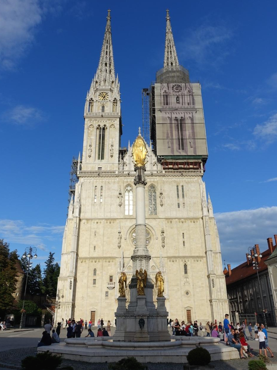 광장을 출발해서 먼저 자그레브 대성당 앞으로 갔다. 서향이라 저녁 햇빛을 정면으로 받은 대성당은 눈이 부셨다. 성당 앞 기둥 위에 서서 성당을 바라보고 있는 황금 마리아상의 뒷모습도 번쩍거렸지만, 외관 보수와 청소를 한 지 얼마 안 된 게 분명한 성당이 더 빛났다. 뾰족한 고딕 성당 한쪽 첨탑은 계속 보수 중이었다. 마침 저녁 미사가 진행 중이던 내부도 깔끔했고 현대적인 마감과 장식도 꽤 보인다. 유적으로 보존하기보다는 계속 고쳐가며 사용하는 성당의 모습이다. 성당 옆 옛 담벼락 일부에는 1880년 지진 때 추락했다는 첨탑 꼭대기 부분과 그때 멈춘 성당 시계를 전시해 놓고 있었다. 몽골의 침략, 오스만 튀르크의 침략 등 여러 차례 무너진 대성당의 지금 모습은 17세기 이후에 개축한 것이다. 진짜 중세 자그레브를 기억하는 유적은 거의 남아있지 않다.