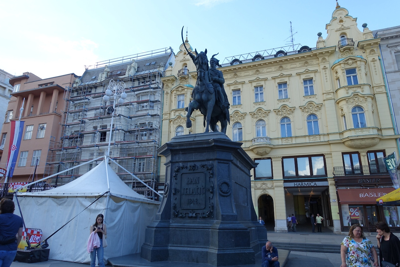 식당 검색을 하다가 자그레브 구시가 주요 관광 스폿 지도가 걸려들었다. 몇 개 없고 서로 멀리 떨어져 있었다면 미련 없이 넘겨버렸을 것이다. 그런데 '구시가'라고 불리는 면적이 아주 좁았다. 볼거리들이 옹기종기 모여 있다. 골목 몇 개만 걸어 다니면 한 시간 안에 다 볼 것 같았다. 어느새 지도 상 루트의 기점을 향해 발맞춰 움직이고 있었다. 기점은 다름 아닌 반 옐라지치 광장이다. 가로로 긴 광장의 북쪽이 중근세의 구시가, 남쪽은 근대 이후 확장된 신시가지다. 광장 한가운데 위풍당당한 반 옐라지치 씨의 기마상이 서있다. 반 옐라지치는 근대 크로아티아의 민족 영웅이라고 한다. 19세기 중반 크로아티아 장군이자 정치가로, 오스트리아와 헝가리 왕가 사이에서 크로아티아의 자치를 확보하려 노력한 인물이었다. 농노제 철폐 같은 업적도 있고 자그레브의 도시 발전에 공헌한 사람인데, 매우 정치적인 인물이라 평가는 갈리는 모양이다. 오늘 그 기마상은 러시아 월드컵에 밀려 잘 눈에 띄지 않는 신세였다. 러시아의 경기가 있는 날이었는데 러시아 단체들이 제대로 잔치를 벌인 것 같았다. 민속공연도 하고, 각종 천막과 무대, 대형 스크린이 설치되어 있었다. 그나마 크로아티아의 경기가 있는 날이 아니어서 광장에 발이라도 디딜 수 있었던 것 같다.
