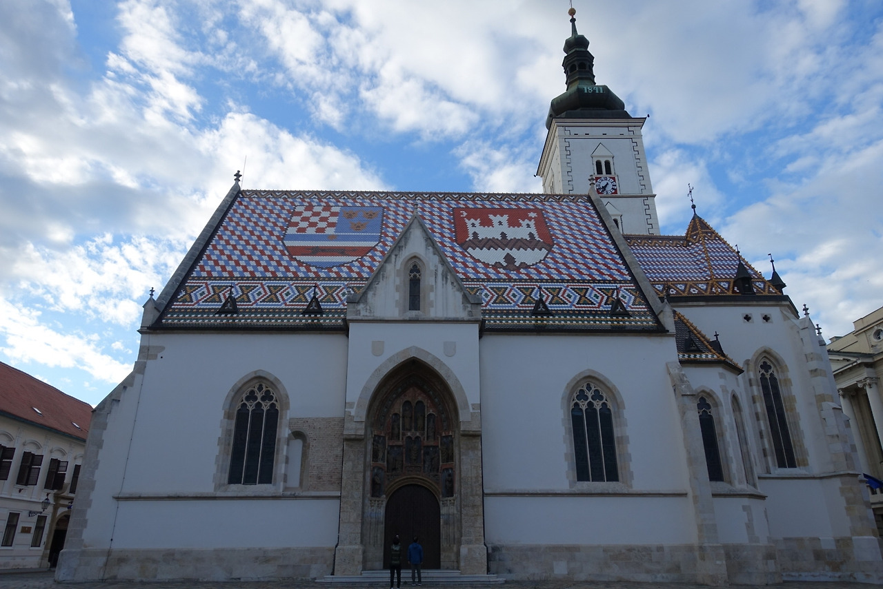 생각보다 언덕이 심한 구시가 동쪽으로 건너가는 길에 '돌문(Stone Gate)'이라는 중세 성문이 하나 남아 있었다. 13세기부터 있었다고 추정하는데, 원래 성벽 구조가 어땠는지는 알 수 없고 오르막 골목에 아치처럼 갑자기 나타난다. 그 와중에 작은 내부 공간은 성모 마리아에게 헌정된 채플이 되었다. 화재에서 살아남았다는 전설 같은 성모자 그림이 있어서, 촛불 켜고 기도하고 맹세하는 공간이 되었다고 한다. 우리가 지나가는 시간에도 기도하는 사람이 있었다. 그 문을 지나 올라간 골목에 자그레브 대성당보다 더 유명한 성 마가(St. Mark's) 성당이 있었다. 연대도 더 오래되어서 13세기부터 있었다고 하지만, 숱한 재건축과 레노베이션으로 겉에서 보면 완전히 새 건물이다. 레고를 연상시키는 컬러풀한 국가와 도시의 문장의 타일 지붕이 유명하다. 빨강, 파랑, 하양, 검정이 섞인 타일 작품은 19세기 말의 대대적인 보수 때 추가된 것이라고 한다. 역사는 길지만 지금 보이는 모습은 현대적 감각의 합작품인 셈이다. 내부는 너무 늦어서 들어가 보지 못했는데 왠지 티 없이 깔끔할 것 같았다.