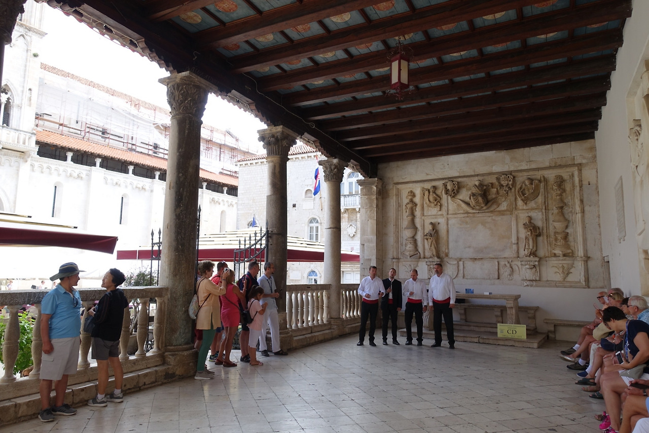 중앙 광장은 작지만 성당, 수도원, 관공서가 면해 있고 이탈리아 중세 도시처럼 직사각형 포디움도 있다. 천정이 있는 포디움은 땡볕을 피하는 널찍한 정자 역할을 한다. 거기도 소리 울림이 좀 있어서, 스플리트처럼 달마티아 포크송을 부르는 아카펠라 그룹이 공연을 하며 시디를 팔고 있었다. 그늘에서 쉬면서 듣기는 좋았지만 스플리트 로마 황궁 현관의 돔 천정 아래보다는 소리가 덜 울려서 시디를 사고 싶을 정도는 아니었다. 물론 광장 전체에 파라솔을 깔고 카페들이 영업 중이다. 카페에서 간단히 요기를 하고 아드리아 해안과 작별을 했다.