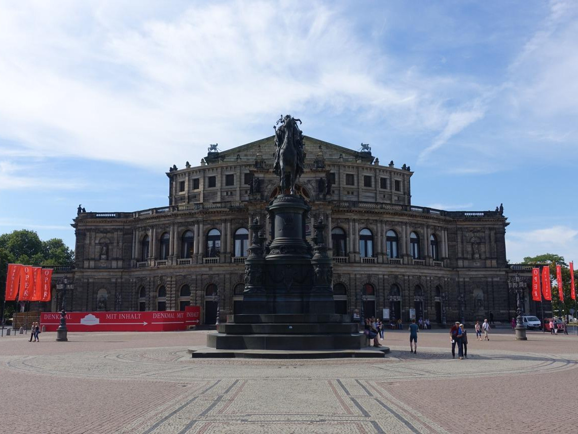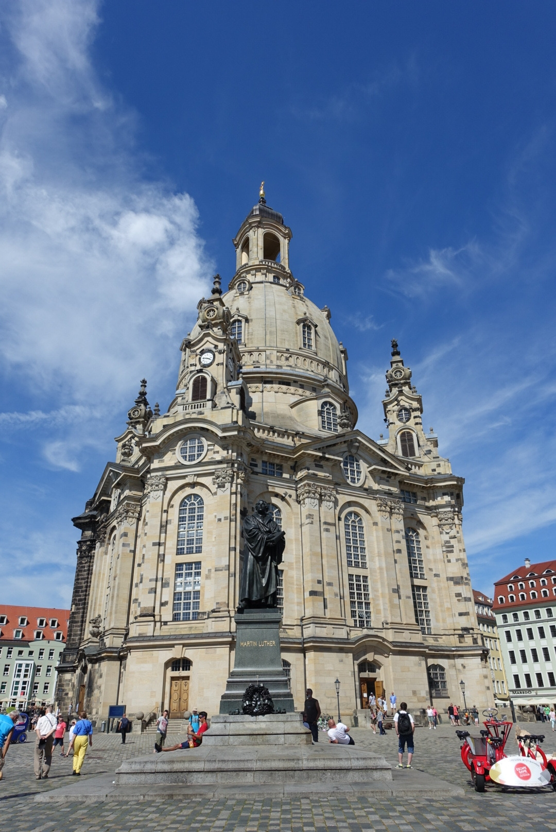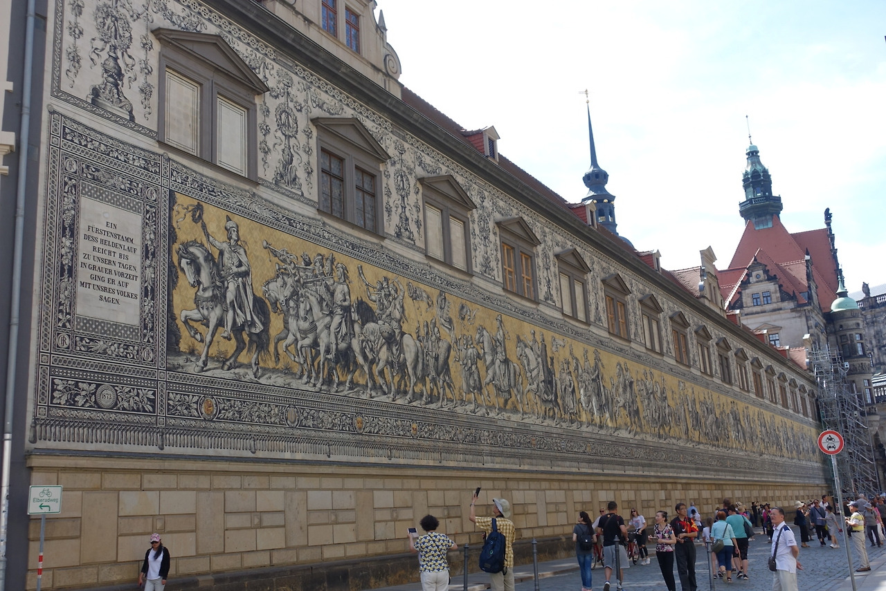 드레스덴은 2차 대전 막바지에 연합군 폭격으로 파괴된 대표적인 사례다. 전쟁의 파괴성을 상징하는 도시가 되었고, 지금은 구시가를 그 전과 똑같이 재건해서 재건의 상징이 되었다. 독일 동부의 중요 도시로, 통일 이후 다시 산업도시로 발전하고 있다. 관광객에게는 완벽 복구했다는 구시가지가 감탄스러울 뿐이다. 헤른후트와 확연히 다른 분위기다. 장식 없는 건물이 하나도 없는 화려한 자태를 뽐낸다. 중세 이래 작센의 왕과 제후들이 머물며 궁전과 구시가가 점점 화려해졌다고 한다. 근처에 도자기 산지로 유명한 마이센도 있다. 럭셔리 상품이었을 도자기가 넘쳐흐르는 부유한 도시였다. 바로크, 로코코 등 웬만한 미술 양식이 다 겹친 그 구시가가 2차 대전 때 완파되었다. 아빠는 1990년대에 한 번 와보셨는데 그때만 해도 상태가 한심했다고 한다. 지금은 츠빙거 궁전, 프라우엔 교회, 오페라 극장 등 눈이 어지러울 정도로 화려하다. 검게 그을린 당시 돌들이 재활용되었다는데 그게 고풍스럽고 화려한 느낌을 더한다. 폭삭 무너졌다는 프라우엔 교회는 대체로 새 자재를 써서 하얗지만 군데군데 까만 돌들을 옛 자리에 끼워 넣어 주근깨처럼 점무늬가 있다.