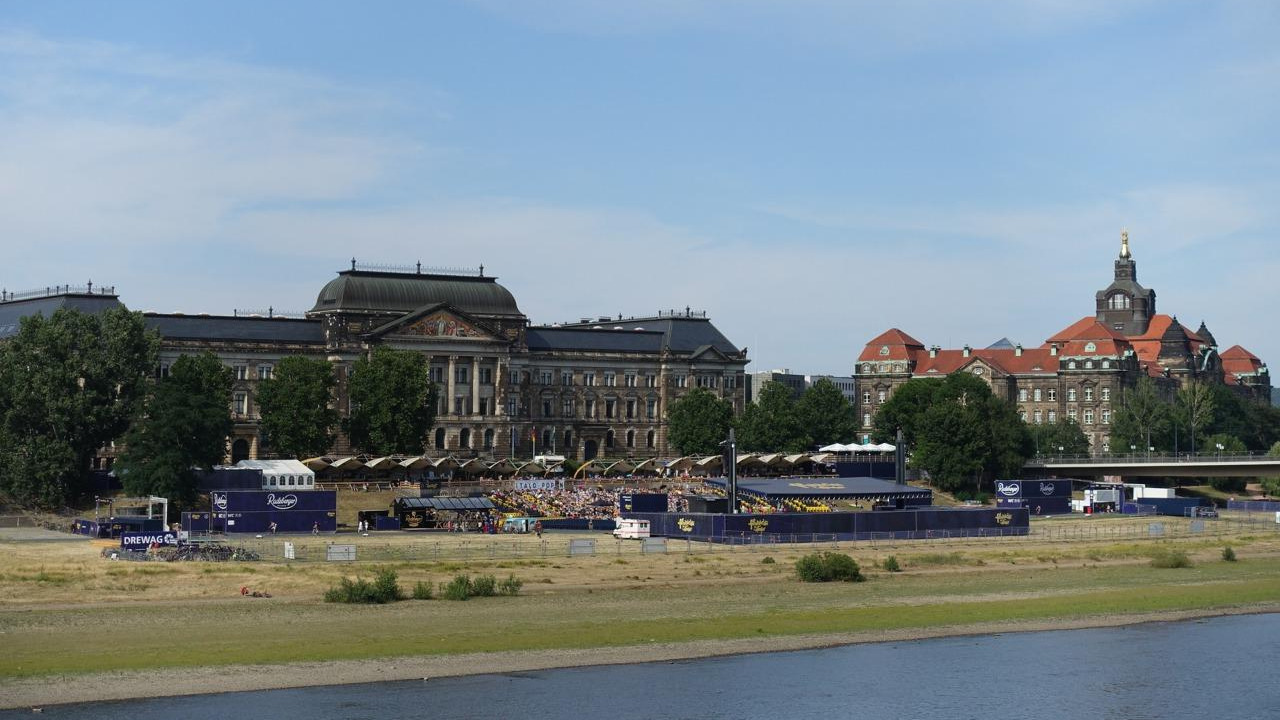 고맙게도 날씨도 화창해서 검게 그을린 벽조차 빛나 보였다. 마이센 도자기 타일로 왕과 제후들을 그려 붙여 놓은 '군주의 행렬' 벽은 폭격 안 맞고 살아남은 거의 유일한 부분이라고 한다. 겨울 출장 때는 우중충해 보이기만 하더니, 여름 하늘 아래 관광객이 되어 다시 보니 군주들도 웃는 것 같았다. 츠빙거 궁전은 보물관과 회화관이 유명하다. 하지만 출장 때 경험에 비추어 내부 관람은 바로 스킵했다. 어차피 시간 내에 꼼꼼히 볼 수 없기도 하고, 겨울 출장 '답사' 차 구경할 때 엄청난 도자기의 압박이 있었다. 일본이나 중국 도자기 소유는 귀족들의 자부심이었고, 특히 이 지역 마이센 도자기 작품이 너무 많다. 대신 궁전 옥상이라 할 수 있는 테라스를 걸으며 햇빛과 구시가 경치를 즐겼다.