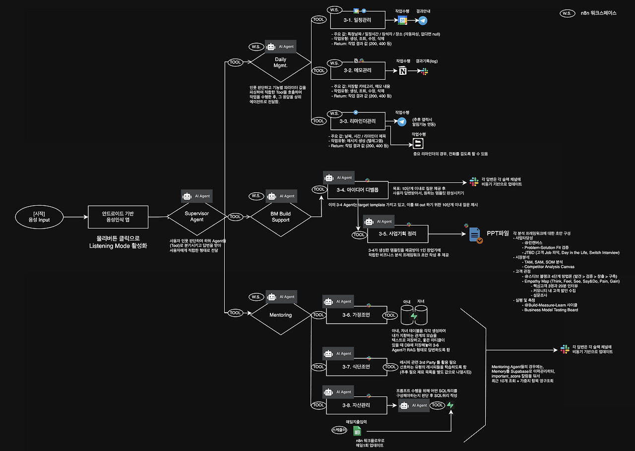 아래는 어제(7/31)까지 구현을 완료한 n8n (AI Agent를 활용한 프로세스 구현을 도와주는 서비스입니다.)의 워크플로우입니다. 아래 기능을 통해서, 한 두 마디 말로 캘린더 일정을 생성, 변경, 삭제, 조회하고 참석자를 자동으로 초대하며, 필요한 경우 작업 수행 결과를 텔레그램, 슬랙 등으로 수신할 수 있습니다.