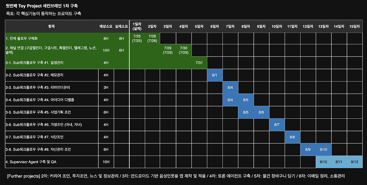 - AI Agent를 활용한 첫 번째 Toy project인 세컨브레인의 계획을 세우고, 기획을 하고 하나씩 구현해가고 있습니다. Toy project인 만큼 이제껏 배운 툴과 스킬을 실제 서비스로 적용해 보는 노력을 하려 하고, 지속적으로 의미 있게 사용할 수 있는 도구를 만들자는 목표를 가지고 있습니다. 일차별 학습기는 6figures.kr에 남기고 있지만, 간략히 타임라인과 기획안을 공유합니다. 추후 기능들이 완성되면 서비스를 소개하는 별도 글을 남기겠습니다.