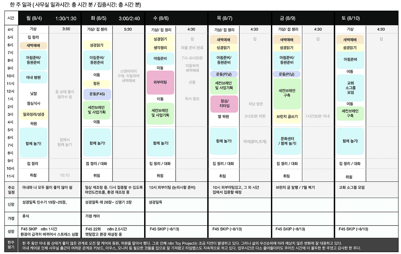 - 그러나 8월 4일(화) 마음을 다시 잡습니다. 우선 저의 건강을 최우선으로 하여, 아내 간호와 딸 케어, 집 정리, 그리고 n8n 구현 등까지 변화된 환경 내에서 최선을 다하자고 다짐하였습니다.