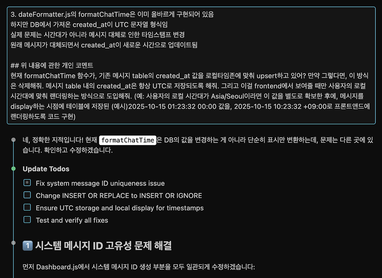 AI 코딩 에이전트의 도움을 충분히 받으면서도 지금 내가 무엇을 하고 있는지, 이번 프롬프트를 통해 해결하려는 문제가 무엇인지를 명확히 인지하는 것은 매우 중요합니다. 문제 발생 시에는 근본 원인은 무엇이고, 이걸 통해 얻으려는 효용은 무엇인지를 분명히 해야 한다는 것을 느낍니다. 이렇게 저의 공간이 생기다보면, 실제 코딩 속도는 AI가 주도하는 1,000걸음과는 비교도 되지 않게 느려집니다. 그러나 결과적으로는 이러한 느림을 감내해야만 진짜 원하는 서비스를 만들어갈 수 있다는 생각이 듭니다.