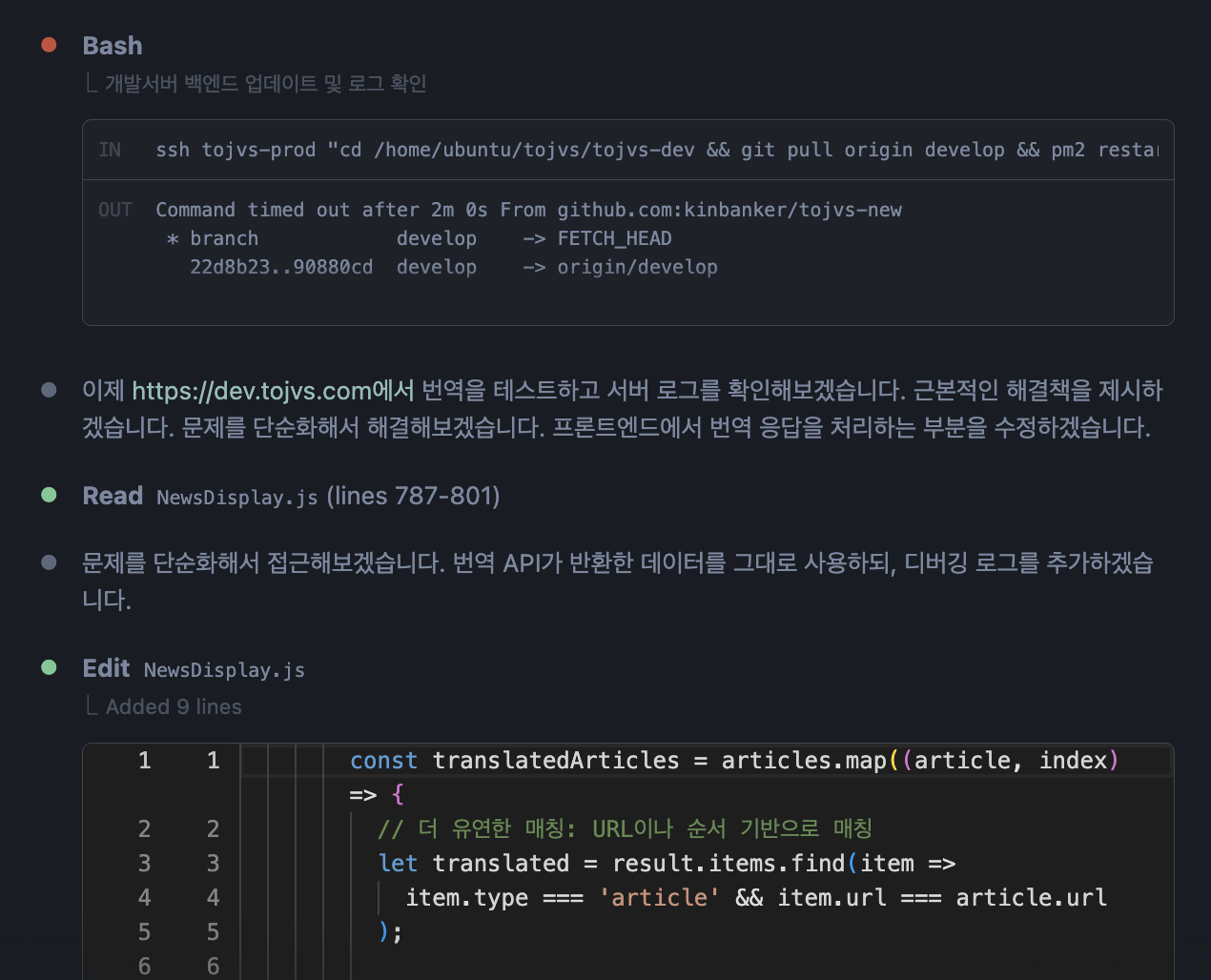 아래 디버깅의 경우는, 영문기사를 한글로 번역하고 이를 보여주는 과정에서 수십 번의 오류가 발생하여, 문제를 더 단순하여 접근하고 하나씩 함께 체크해 가는 과정이 있었습니다.