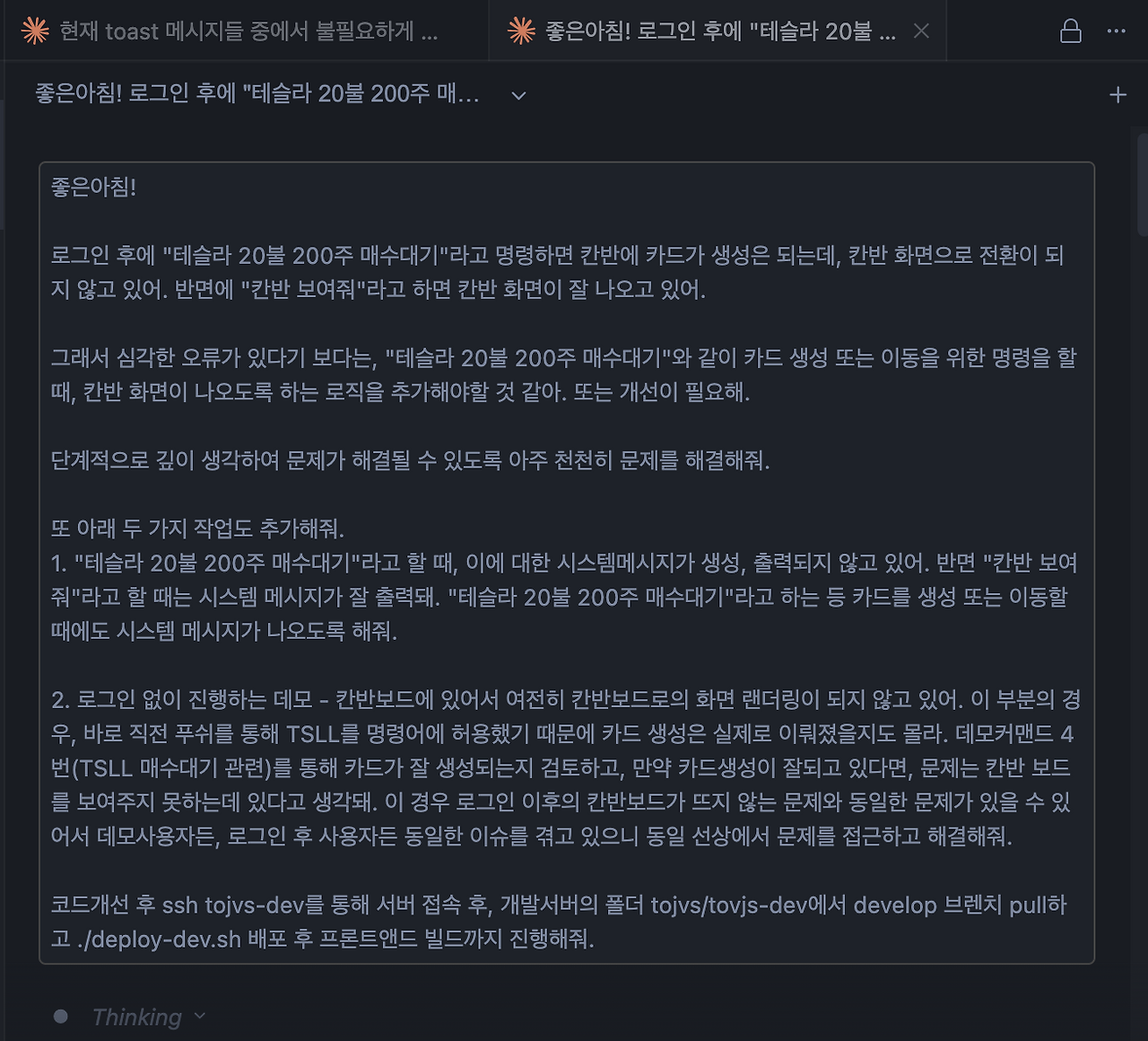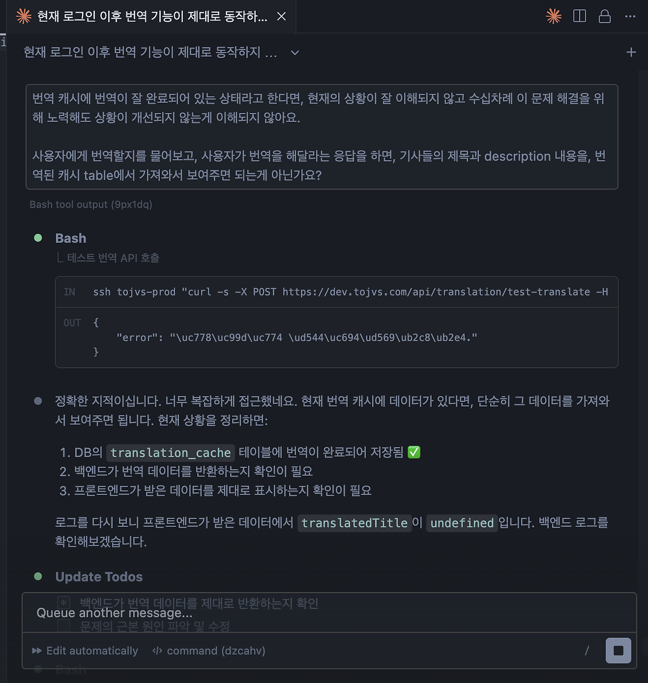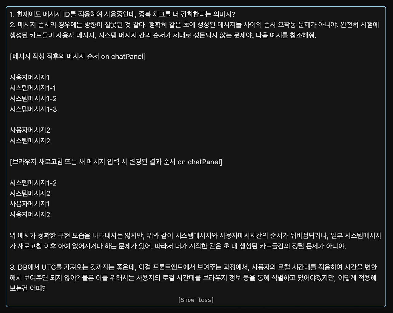 원인 분석에 대해 AI가 답변을 주면, 먼저 이 답변을 제대로 이해하기 위해 노력하고, 명확한 원인을 찾을 때까지 몇 차례 더 디깅 합니다. (이러한 과정에서 분당 1,000걸음으로 달리던 바이브 코딩의 속도가 확 줄어듭니다. 그러나 방향은 훨씬 더 정확해집니다.)