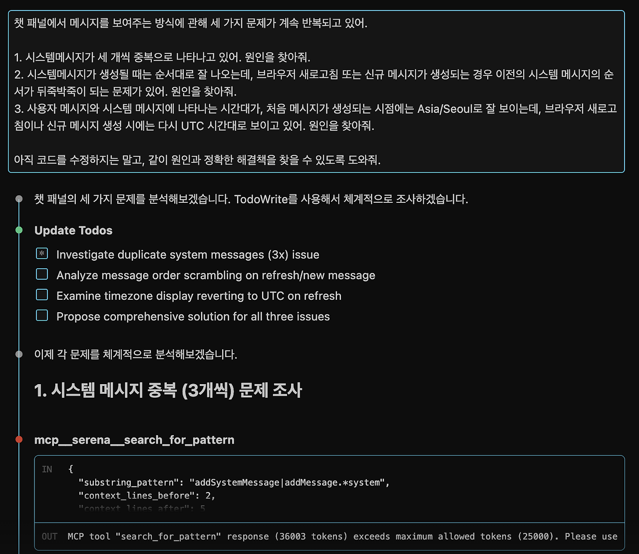 체감상 약 60~70% 정도의 문제는 위와 같은 1차원적인 접근으로도 해결되었습니다. 그러나 때로는 4~5번을 디버깅해도, 어떤 경우에는 하루 이틀에 걸쳐 수십 번을 요청해도 문제가 계속 반복되는 경우가 있었습니다. 1번 문제를 해결하면 2번 문제가 등장하고, 2번 문제를 해결하면 다시금 1번 문제가 재현되는 경우도 더러 있었습니다. 이럴 때 1,000걸음의 속도를 확 늦추었습니다. "일단 코딩하지 말고, 나랑 같이 원인을 찾아보자."라고 한 걸음 뒤로 물러서서 근본 원인을 찾아보려 노력했습니다.