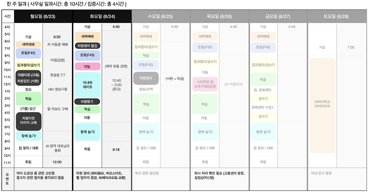 - 최근 글쓰기 시간에 많은 시간이 투자되는 부분에 대한 고민을 얘기했는데 (1) 우선 글쓰기는 나만의 다음 스텝을 준비하는 과정에서, 나의 생각과 기준을 정리해 간다는 측면에서 너무 좋은 것 같다는 의견과, (2) 그럼에도 우선순위에 맞춰서, 학습을 우선적으로 하고 글쓰기는 그 이후로 미루는 것이 어떨지 제안해 주었다. 그 결과, 오늘(6/25)은 일과 시간에는 좀 더 학습에 집중하려 노력했고, 그 이후에 글쓰기를 하고 있다. (일과 중에 다 마치지 못해서 밤늦게 글을 쓰고 있다는 것은 개선이 필요한 지점이다.)