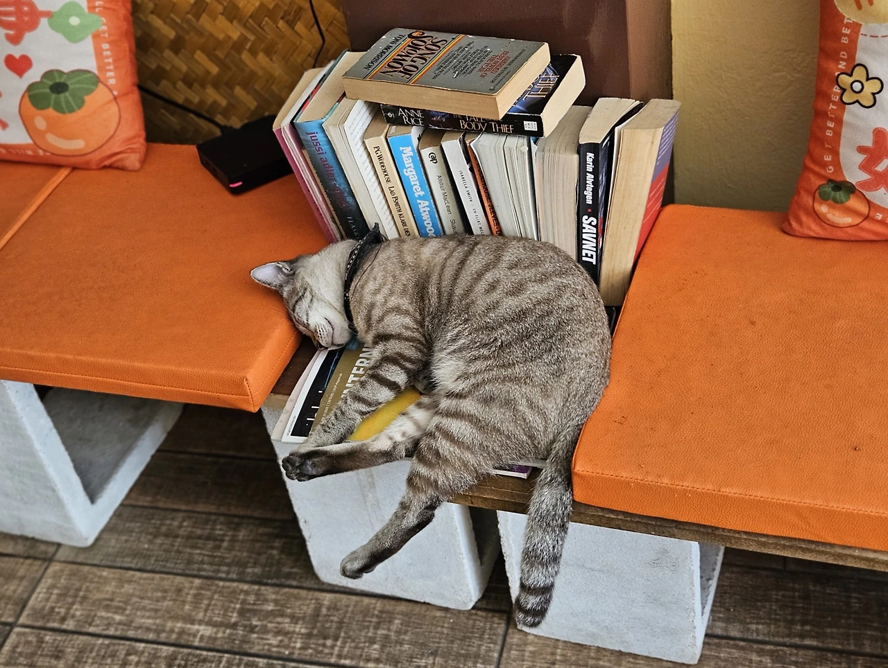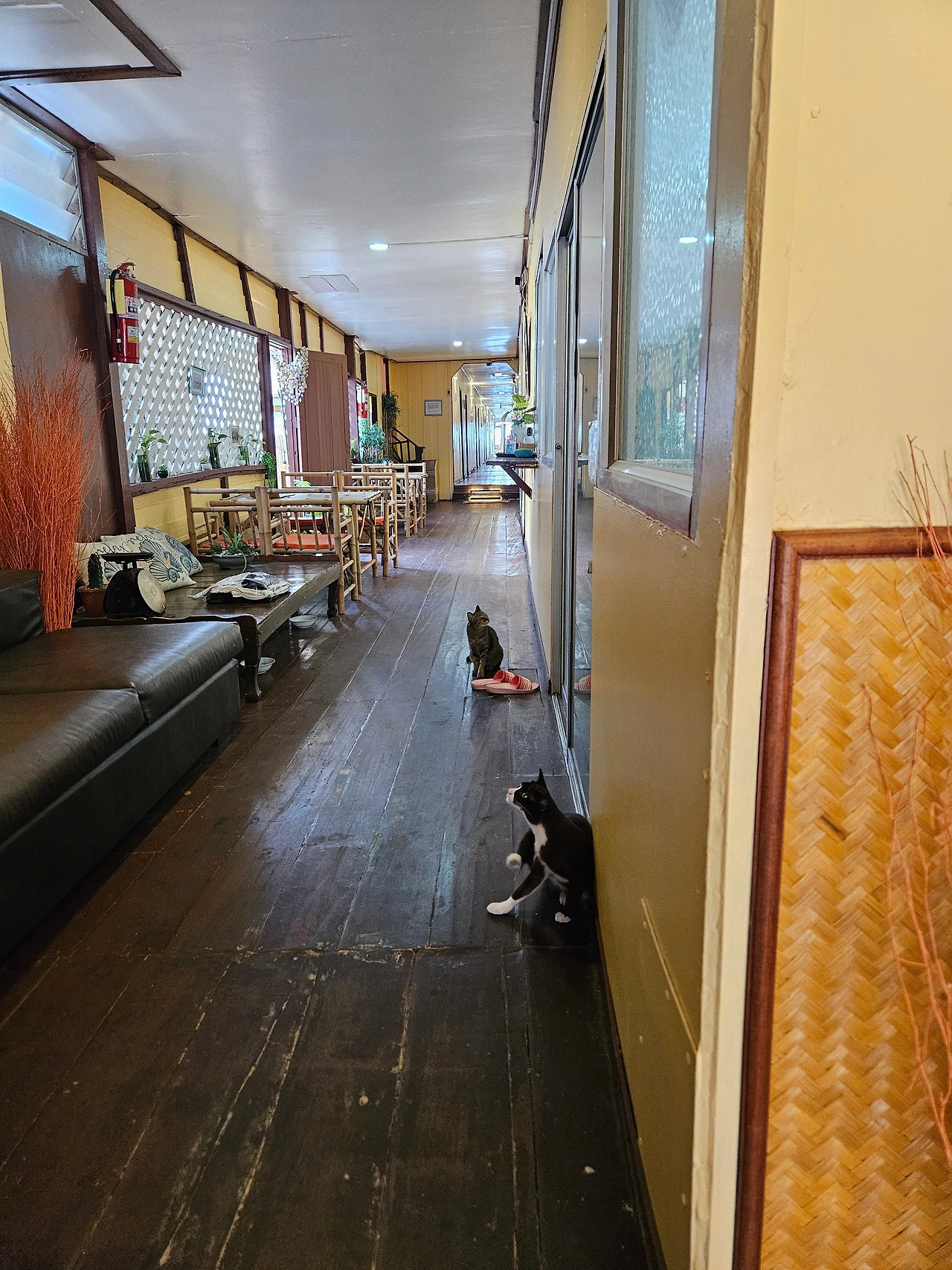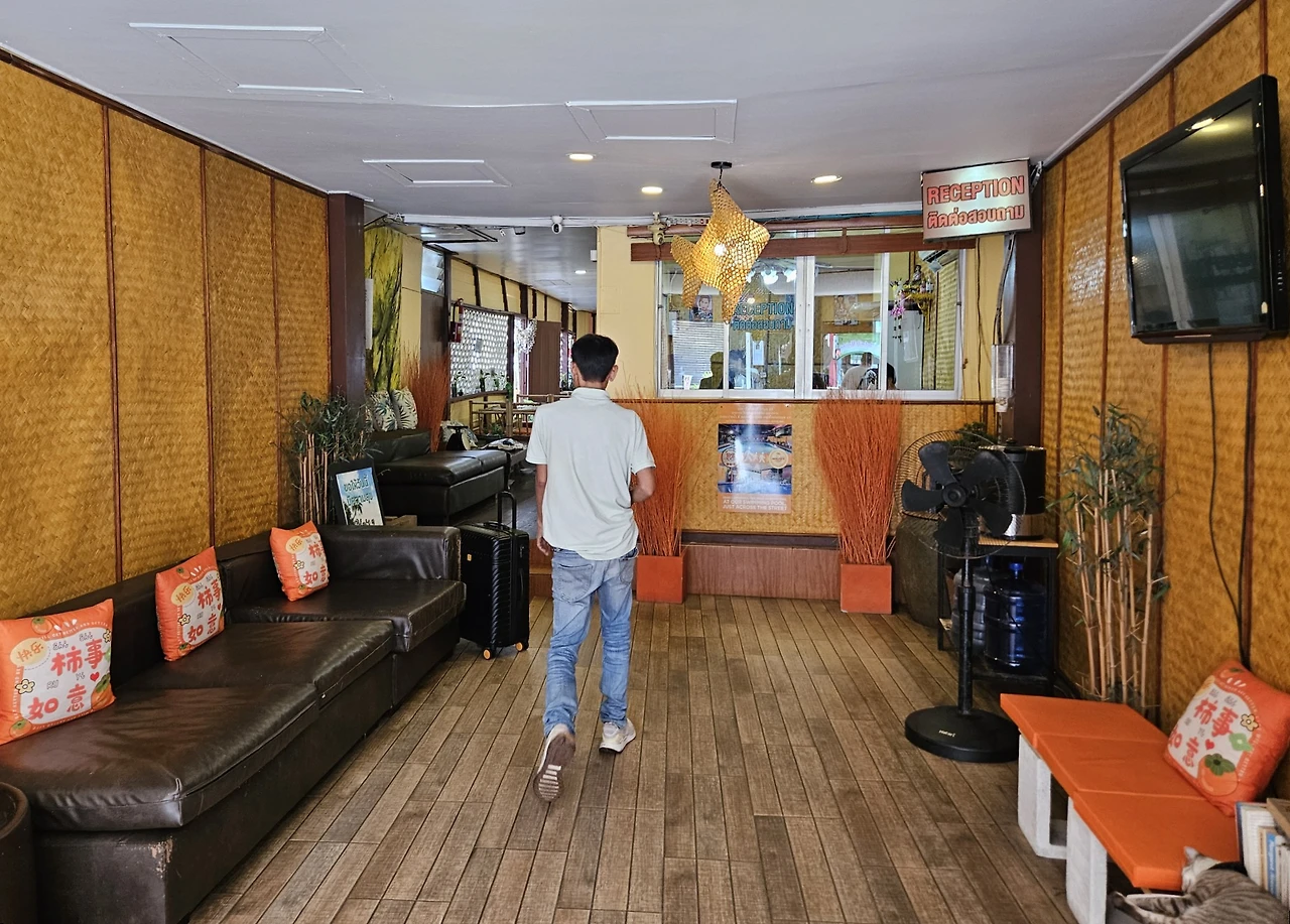 후아힌 역에 내려서 점심을 먹으러 간 식당입니다. 입구가 게스트 하우스의 리셉션이라 찾기 어려울 수 있어요. 오렌지색 쿠션과 고양이들이 보이면 이곳이 맞습니다.