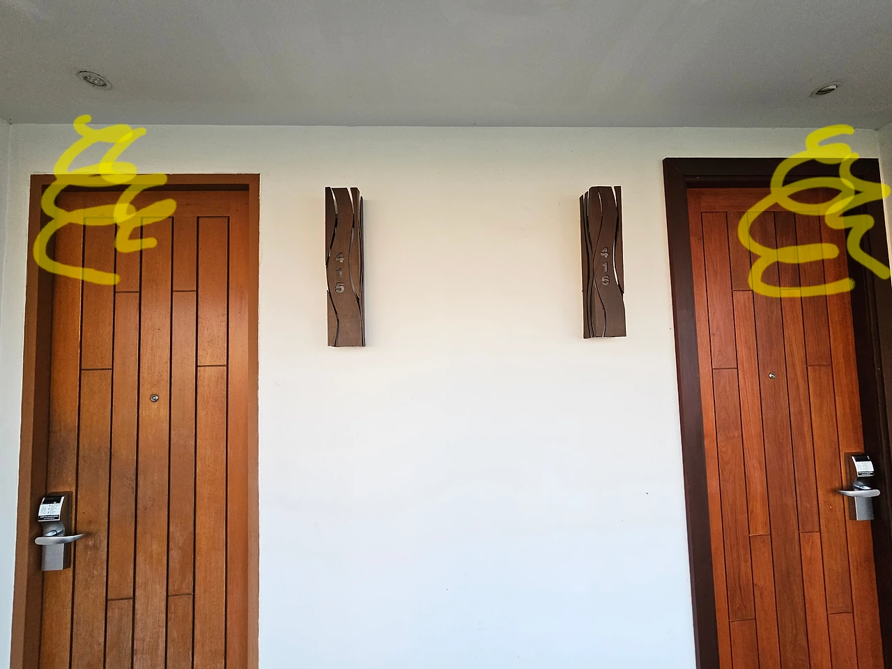 저 현관문 앞 천장 등에 파리처럼 생긴 손톱만 한 날벌레 수십 마리가 달려들고 있었어요... (차마 사진 대신 그림으로 대체합니다.) 저희는 어떻게 방 밖으로 나오긴 했는데, 나와 보니 숙소 복도의 모든 문 앞마다 광란의 도가니였습니다....