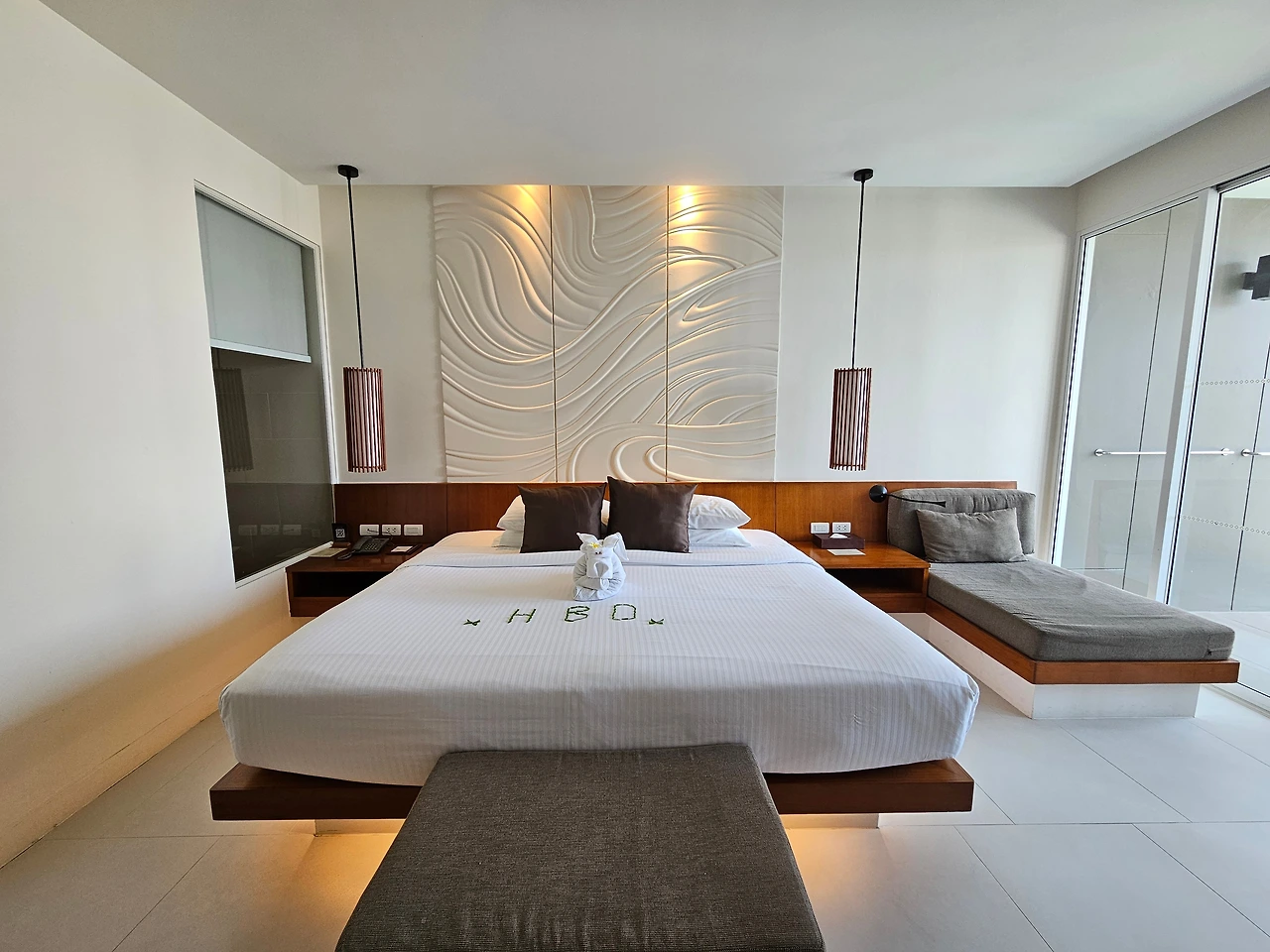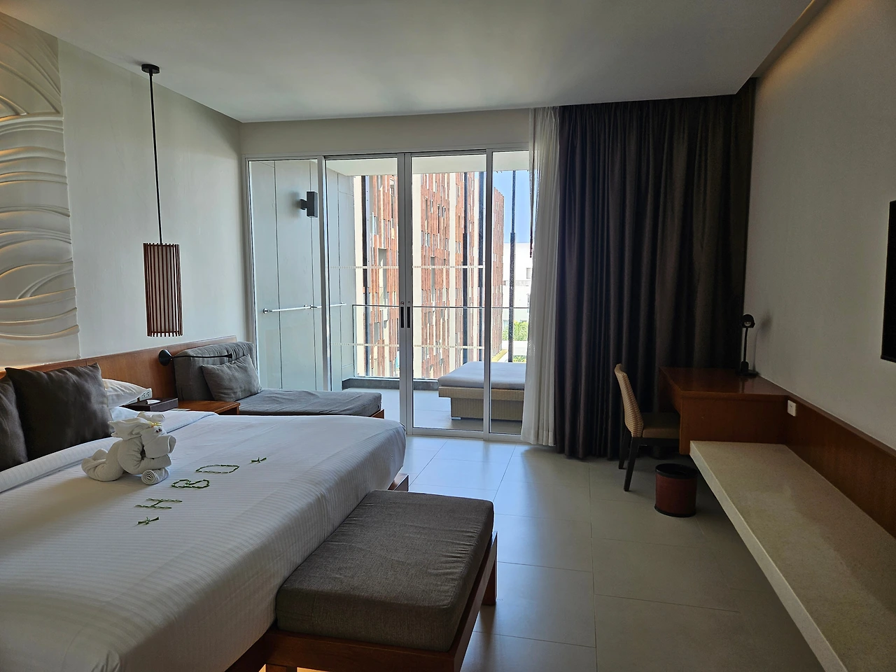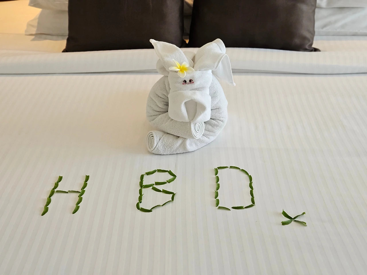 이번 여행은 배우자의 생일 여행이었습니다. 특별한 기념일이니 고층의 좋은 뷰를 부탁했어요. 정말 수영장이 한눈에 내려다보이는 좋은 방이 배정되었더라고요. 베드는 킹사이즈라 이후에 묵은 5성급보다도 컸고, 룸 크기도 굉장히 넓었어요. 그리고 무엇보다 저 귀여운 수건 코끼리 (코가 없는 것 같은데 코끼리가 맞겠죠?) 덕분에 방문을 열자마자 배우자가 너무나 좋아해 주었습니다. 다행이야 ㅠ ㅠ