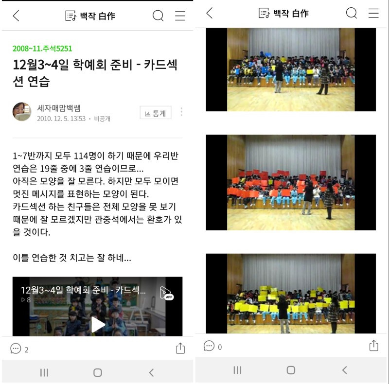 2020년 코로나로 인하여 여러 가지 행사는 없었지만 지나온 기간 동안 가을 행사 종목별 하나씩 기억나는 내용을 떠올려 보려고 합니다. 2010년 가을부터 준비하여 겨울 학예회-카드섹션 2010년 동학년 선생님들과 의논을 하였다. 학년에서 2개의 공연만 하게 되어서 공연에 소외되는 학생이 없도록 하기 위해 많은 인원이 참여하는 카드섹션 공연을 계획했다. 그 당시 7개 학반이 동시에 모이기 어렵기 때문에 학급당 3줄을 책임지고 각반에서 연습을 한 후 전체 연습 때 합쳐보는 활동을 하였다. 그 당시에는 엄하게 지도하는 경향도 있었고 학생들이 교사의 권위에 잘 따라주었기 때문에 100명이 넘는 학생들을 하나의 공연으로 뭉칠 수 있었지 않았을까? 카드섹션 공연의 마지막은 태극기 장면이었다. 8절 도화지를 100개 넘게 펼쳐서 태극기를 구성한 동학년 선배 선생님의 작업 모습이 아직도 생생하다. 누구보다도 미술에 열의가 가득하시고 예술을 사랑한 선생님은 긴 복도에서 불편한 자세로 하루 종일 태극기를 조각조각 구성한다고 고생을 많이 하셨다. 카드섹션 공연을 한 후 우리는 뿌듯해했지만 공연에 올라간 학생들은 자신의 공연 결과를 정확히 알 수 없었기 때문에 아쉬워했다. 그나마 마지막 태극기 함성으로 인하여 뿌듯했으리라 생각한다. 교직경력 7년 차의 학예회는 이렇게 마무리가 되었고 준비과정에서 한두 명이 참여하지 않았는데 그 아이들이 소외감을 느끼지 않았기를! 다행히 관중석에서 카드섹션을 응원하는 마음으로 잘 봐주었기를! 그 당시 마음에 여유가 있었다면 관중석의 아이들과 대화라도 하는 건데. 아쉬움이 남아있다.