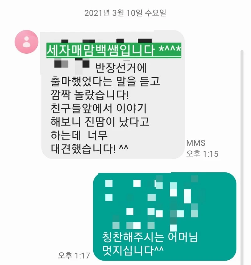 덧붙여서 봉사위원 선거 후 주고받은 문자도 첨부한다. 어머님의 자상함을 나도 배우고 싶다.