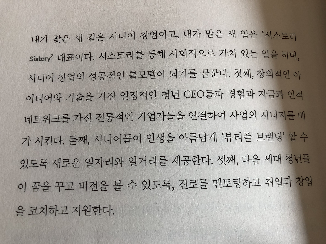 그리고 두 번째는 은퇴 후 야인으로 돌아가려고 양양에 가 있을 때 사람들이 찾아와 놀지 말고 함께 창업을 하자고 제안을 해 '시스토리'를 창업했습니다. 양양에서 지내던 집을 '꿈꾸는 요새'라고 이름 붙이고 살고 있었는데, 이전에 병원에서 일할 때 만났던 사람들이 그 당시 일할 때 좋았다며 저를 찾아온 것이었습니다. 전혀 다른 6명의 사람들이 모여 한 팀처럼 일하고 있습니다. 시스토리는 시니어와 청년의 성장과 창업을 돕는 기업입니다. 저는 시스토리를 통해 시니어 창업의 성공적인 롤모델이 되기를 꿈꾸고 있습니다.