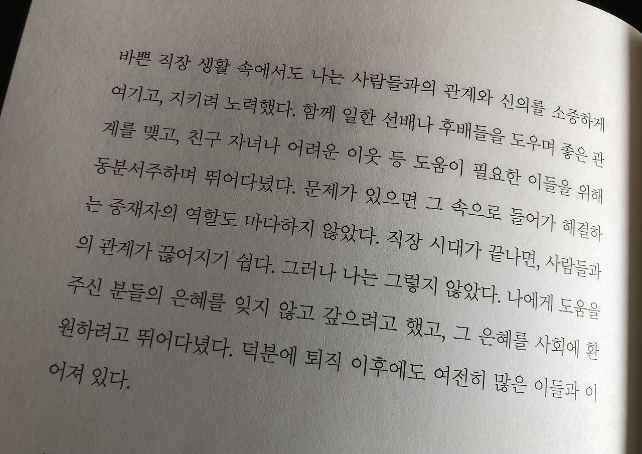 - 인생 후반에 전성기가 있으려면 전반기에 어떤 삶을 사는가가 중요합니다. 그래서 젊은 세대에게 (인생) 전반기에 좋은 사람과의 관계를 잘 만들어야 은퇴 후 삶에서 전성기를 누릴 수 있다고 전하곤 합니다. 저는 은퇴 후에 직장 동료였던 사람들을 만나는 일이 많지 않습니다. 사람을 얻는 삶이 아니고 성공하는 삶을 살았던 결과지요.