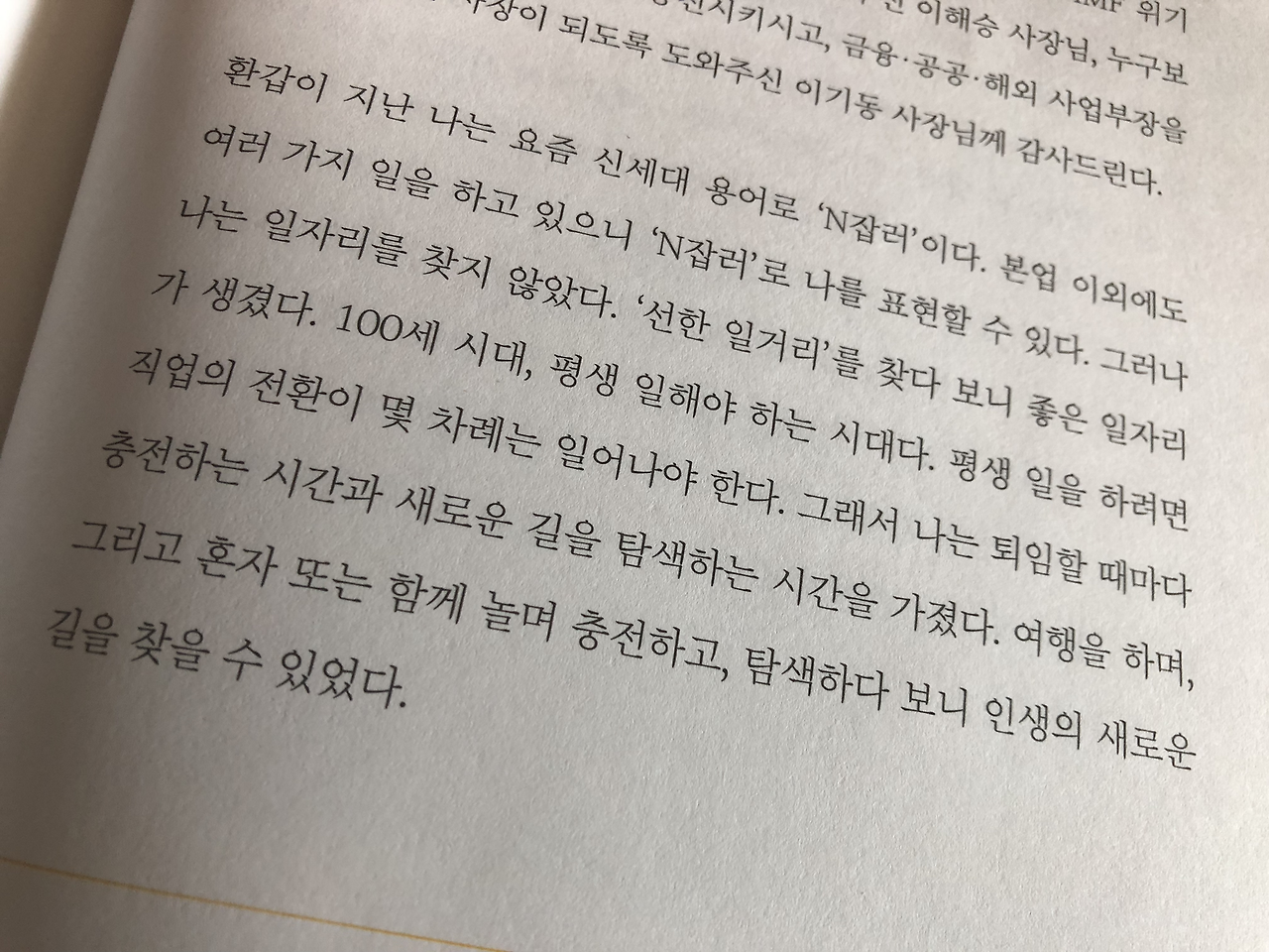 그래서 일에 대한 관점을 넓히거나 좀 다르게 볼 필요가 있는 것 같습니다. 저는 은퇴 후 한 장학 재단, 선교 활동, 동창회 일 등 열몇 가지의 일을 하고 있는데요. 2가지 정도는 수입이 생기는 일이고, 9가지는 수입은 없는데 명함이 생겼습니다. 월급이 나오는 것은 아니지만 주부가 하는 가사를 '가사일'이라고 하듯, 봉사도 돈을 버는 것은 아니지만 일이라고 봅니다. 경제적 수단의 일만이 일은 아니라는 게 제 생각입니다.