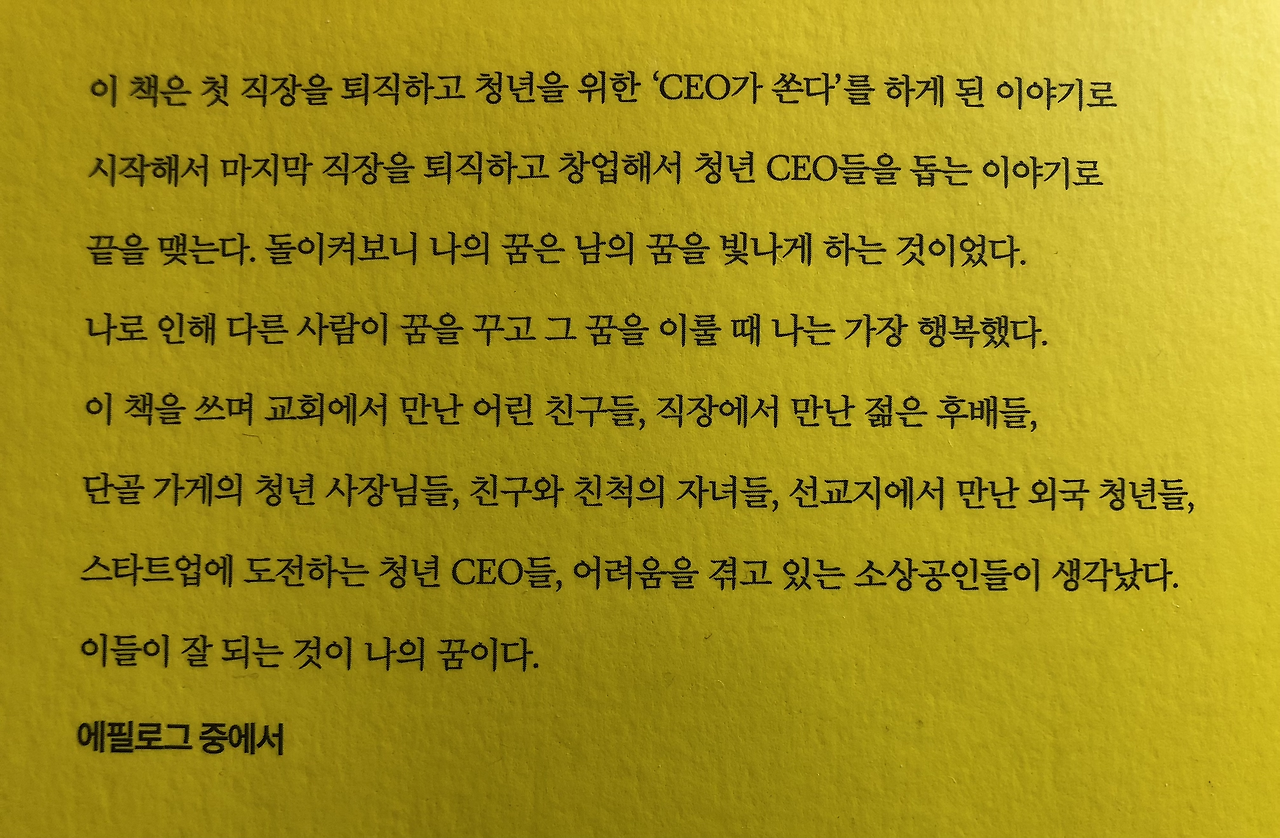 다만, 이 책은 일종의 '이루겠다'는 제 나름의 의미입니다. 저는 돕는 걸 좋아합니다. 누군가를 빛나게 하는 걸 좋아하지요. 전도사 기질이 있어서 그런지 모르겠습니다만, 제가 가진 경험이나 지식, 또는 네트워크 등을 청년들과 나누어 그들에게 도움을 주고 싶습니다. 실제로 청년들이 용기를 얻어 가는 모습을 보면서 기쁘고, 더 많은 사람들에게 도움이 되길 바라면서 이 책을 썼습니다.