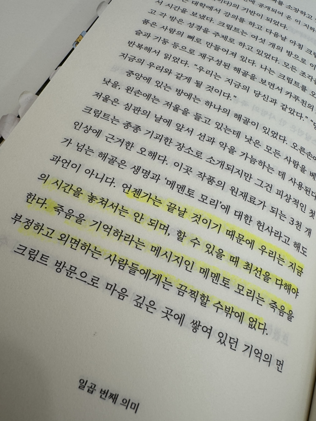 언젠가는 끝날 것이기 때문에 우리는 지금의 시간을 놓쳐서는 안 되며, 할 수 있을 때 최선을 다해야 한다. 죽음을 기억하라는 메시지인 메멘토 모리는 죽음을 부정하고 외면하는 사람들에게는 끔찍할 수밖에 없다. 평생을 쾌락과 재미를 좇아 살았다면, 세상과 작별을 고하는 일이 고통스럽고 어려울 것이다. 목표가 없고, 쌓이지도 않고, 성취에 이르지도 못하는 활동으로는 삶을 즐길 수 없기 때문이다. 자신을 더 큰 이야기의 일부로 보는 것이 필요하다.