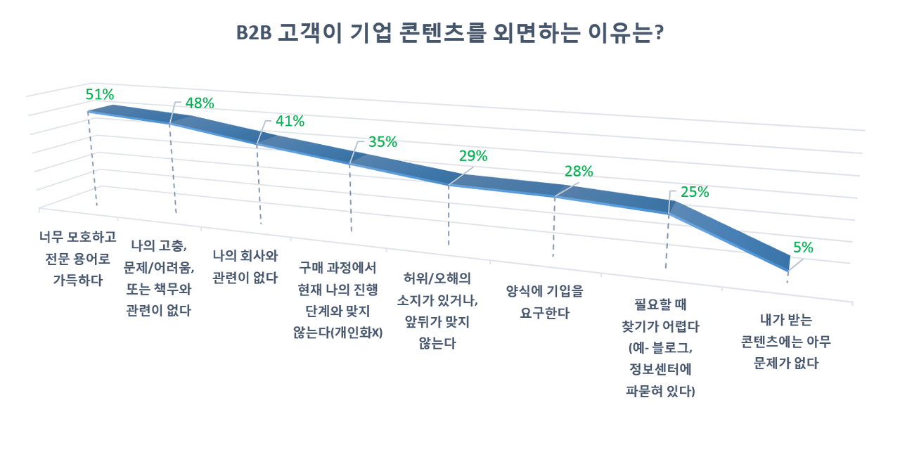 글로벌 마케팅 기업 DGR은 2019년 발표 자료에서 B2B 고객은 짧은 형식(93%)으로 되어 있고, 정보 출처가 확실한(95%) 산업 전문가 및 영향력자들의 콘텐츠(95%)를 선호한다고 밝혔어요. 앞서 언급한 지금의 산업 및 사회적 환경 변화가 그대로 반영된 조사 결과가 아닌가 해요. 고객은 너무 많은 정보에 지쳐 있어요. 허위적이거나 모호한 내용들 때문에 짜증이 나죠. 때로는 정보의 진위나 신뢰를 판단할 만큼 제대로 살펴볼 시간적 여유조차 없을 때도 많아요. 누가 한눈에 파악할 수 있는 제대로 된 정보를 제공해 준다면 그보다 더 좋을 수는 없을 거예요. 콘텐츠 마케팅을 한다면, 이런 고객의 환경과 상황을 제일 먼저 이해해야 해요. 한마디로 고객의 입장이 되어 보는 거죠. ‘내가 고객이라면?’