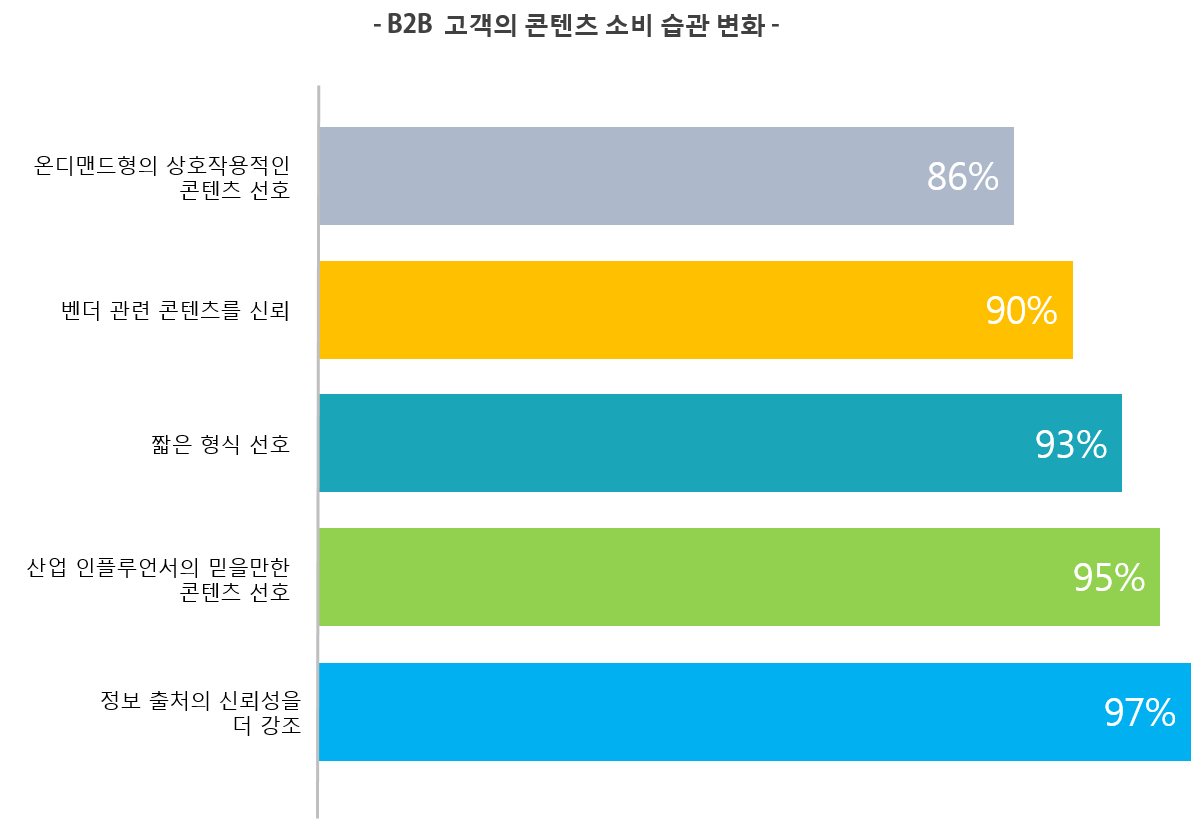예를 들어, 디지털에 익숙한 밀레니얼 세대는 회사에서 기업용 솔루션을 구매할 때 영업 사원을 먼저 만나기보다는 인터넷을 이용해 제품 정보를 먼저 찾는 경향이 강해요. 만약 포화 상태의 콘텐츠 홍수 속에서 사실적이고 신뢰할만하며 창의적이기까지 한 콘텐츠를 발견하면, 그들은 스스로 콘텐츠를 공유하며 제공 기업에 관심을 갖죠. 그 말은 달리 하면, B2B 마케터들이 ‘사실에 근거한 믿을만한 정보를 창의적인 형태’로 만들어야 경쟁자들보다 가망 고객 확보에 더 유리하다는 의미이기도 해요.