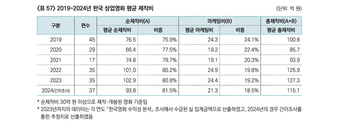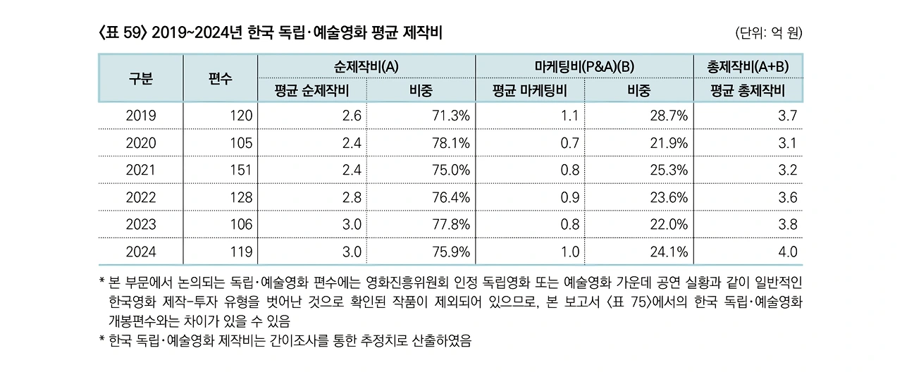 영화진흥위원회에서 발표한 [2024 한국 영화 결산]을 볼까요. 보시면 한국 상업 영화 평균 제작비용은 약 115.1억 원가량이었고, 독립영화도 마찬가지로 4억 원 이상이 들었습니다.