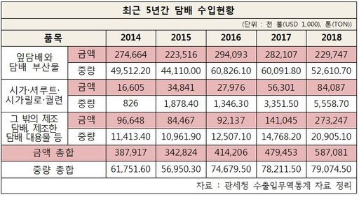관세청의 수출입무역통계에 따르면, 지난해 담배수입 총액은 5억 8708만 달러로 전년(4억 7945만 달러)보다 22%가 증가했다. 잎담배 원료와 담배제품, 전자담배 등 담배와 관련한 전체 수입액과 물량이 최근 5년치를 기준으로 최고 수준이다. 물량면에서도 2016년 7만 4679톤, 2017년 7만 8211톤, 2018년 7만 9074톤 등 증가 추세다.