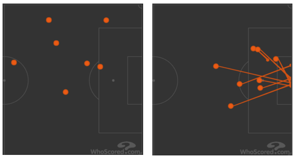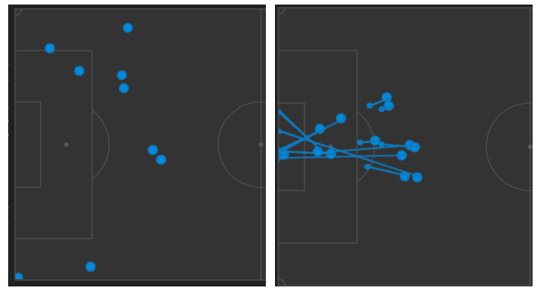 키패스의 경우 중앙 2개는 아마티 교체 이후입니다. 둘을 제외한 나머지 키패스는 대부분 좌측, 즉 아마티쪽에서 발생했죠. 슛팅 또한 가장 아래에서 찬, 사실상 유일한 우측 슛팅은 다르미안이 파고들었을 때 슛팅이고, 나머지 슛팅들은 또 왼쪽에서 발생했습니다. 간혹 키패스와 슛팅의 위치가 반대인 경우가 있습니다. 키패스가 좌측에서 우측으로 건너갈 경우 우측에서 슛팅이 발생하죠. 맨유의 이번경기 대다수의 찬스는 왼쪽에서 나와서 슛팅도 왼쪽에서 가져갔습니다. 수비 무게중심이 흔들리며 발생한 장면들이 아닌, 철저히 왼쪽을 공략해서 왼쪽에서 거둬들인 결과물이라는 것이죠.
