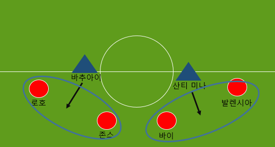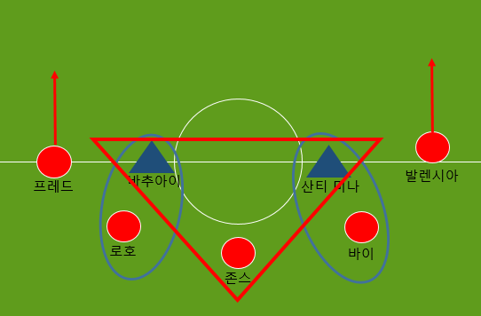 이번 경기 필 존스의 자책골은 너무나 치명적이었습니다. 반전을 꾀하던 팀에게 바로 찬물을 끼얹었죠. 근데 전 필 존스가 자책골을 넣었다는 그 사실보다 다른 문제를 언급하고 싶습니다. 그가 커맨딩을 너무 못했다는 것이죠. 필 존스는 이 경기에서 바이와 호흡을 맞췄습니다. 필 존스는 과거 퍼거슨이 데려올 때부터 커맨더의 역량을 보여주었죠. 경험이 부족할 뿐 당시 클럽과 감독은 이 선수가 차기 수비진의 리더가 될 것이라며 당시 나이에 비해 상당히 큰 액수로 필 존스를 영입했습니다. (아마 300억이 넘었죠? ) 실제 최근 경기에 나서도 수비진 이 곳 저 곳 지시하며 커맨딩을 하는 모습을 보이긴 했는데.. 결론적으로 실패입니다. 먼저 자신과 가까운 풀백인 로호를 컨트롤 하지 못했습니다. 물론 이건 로호의 문제이기도 하지만, 필 존스는 그 상황에서 로호에게 간격 유지를 콜했어야 했습니다. 또한 바이의 위치도 통제하지 못했죠. 자책골 장면 자체는 존스의 잘못보다는 바이의 잘못이 큽니다. 바이가 자신의 포지셔닝을 지키지 못하고 상대에게 끌려나갔고, 그 공간으로 볼이 공급되었죠.