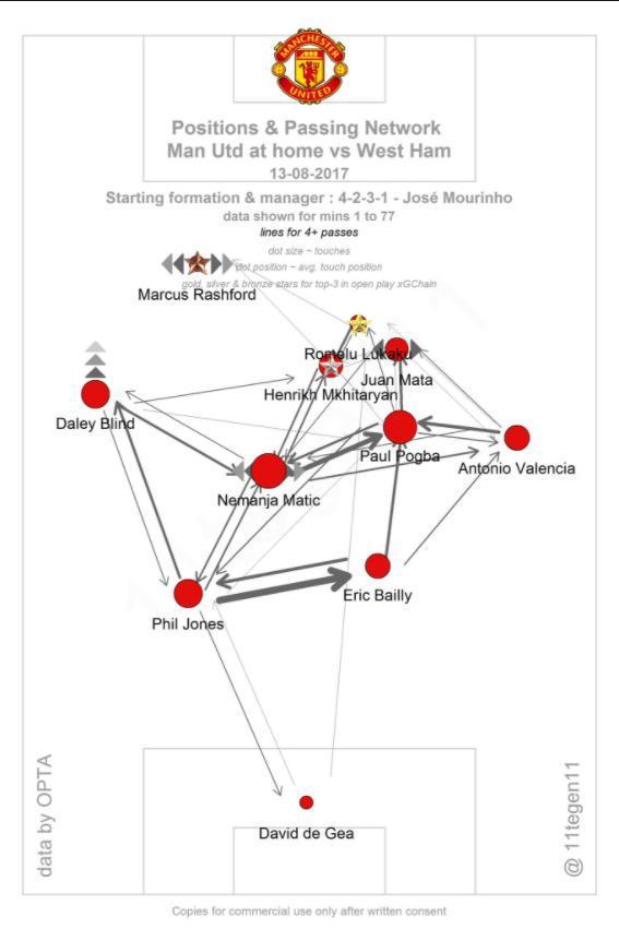 좌측 사진은 17-18 시즌 유나이티드의 개막전 경기의 패스맵입니다. 보시다시피 우측 하프스페이스에 미키-마타-포그바가 삼각편대를 형성하고, 그 앞에는 스트라이커 루카쿠가 있습니다. 그리고 2선 윙어인 래쉬포드가 루카쿠보다 더 전진한 위치에 있죠. 아이솔레이션을 통한 좌측 윙어의 1 대 1 상황 조성.